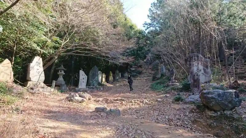 山頂には奥宮があり20〜30分で行けるとのことだったので、登ってみることにしましたが、奥宮への参道?は石がゴロゴロ、岩がゴツゴツのほぼ崖・・・魂が抜けます。途中の中宮を経て約650mの急坂をヒィーヒィー言いながら40分近くかけて登頂。標高差約180m。頂上からは遠く名古屋の街まで見渡せます。