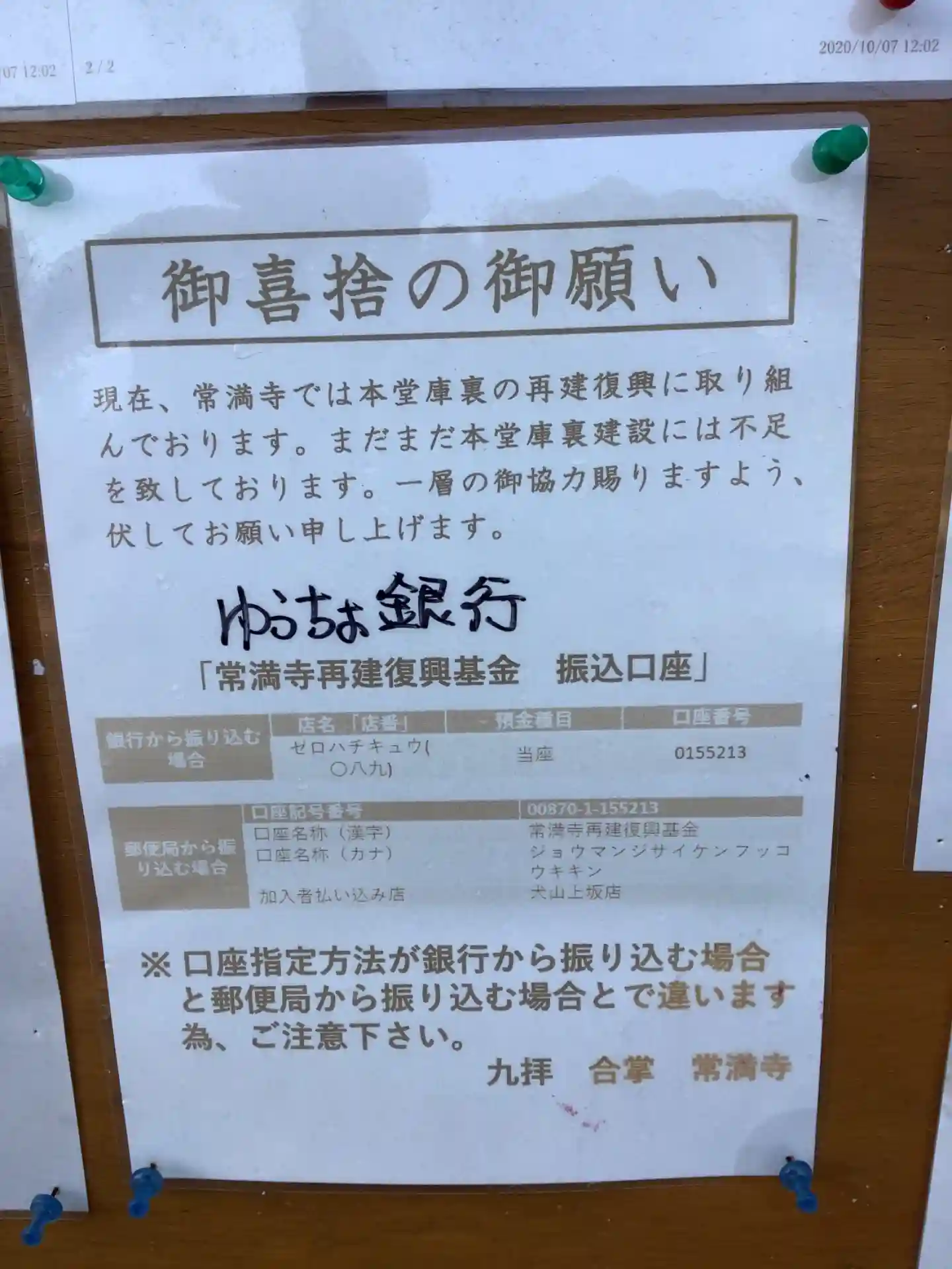 本堂工事中の常満寺さんの御朱印です。
