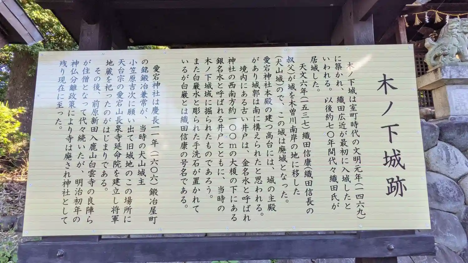 ここには文明元年(1469年)織田広近が築いた木の下城があった(犬山指定史跡)
