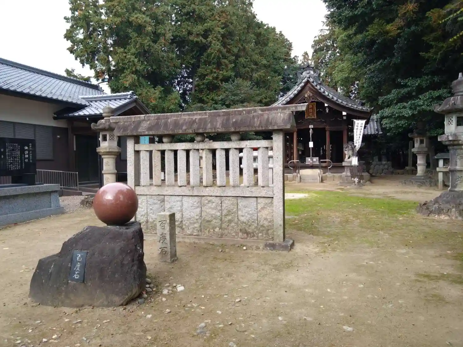 広い道路沿いにありますが、百度石の上にある茶色い玉は何でしょうか?