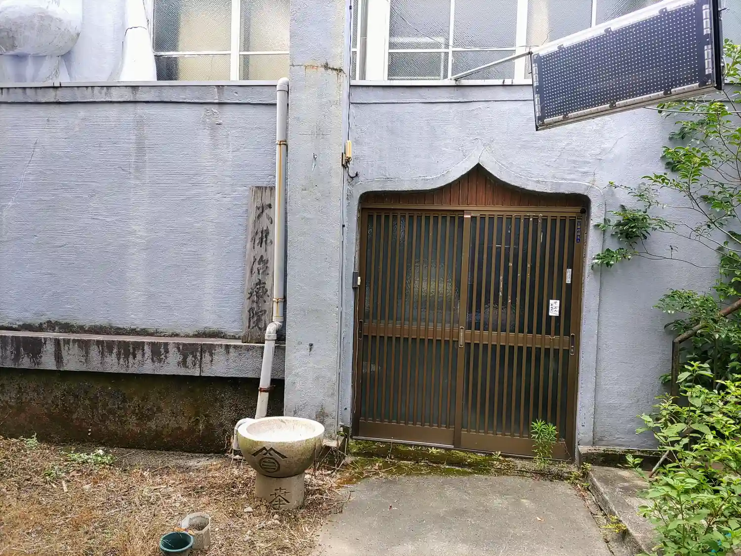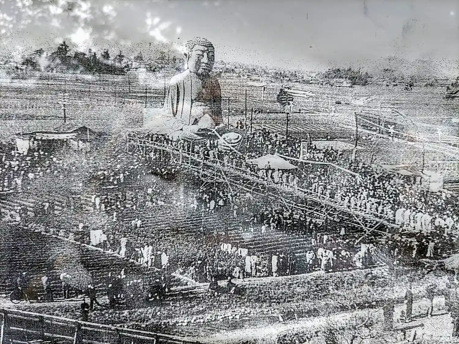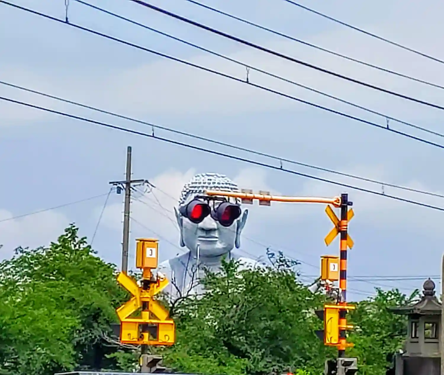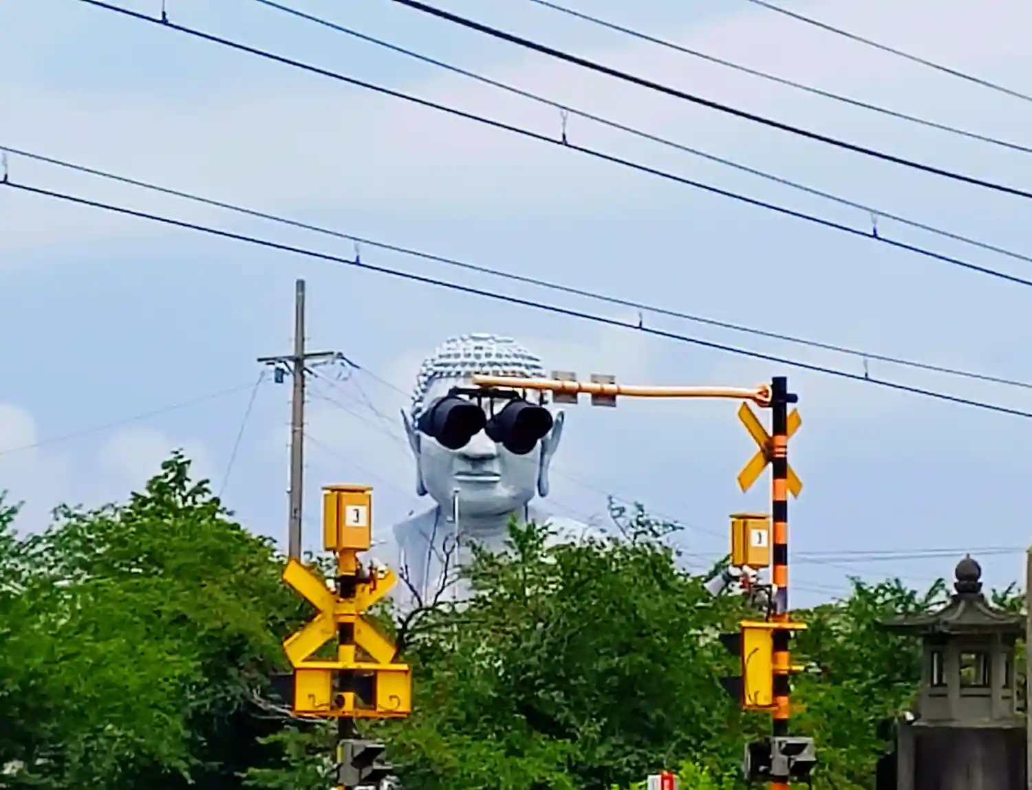 ある場所から見ると踏切の信号がちょうど大仏の目と重なり、サングラスをかけているように見えます。