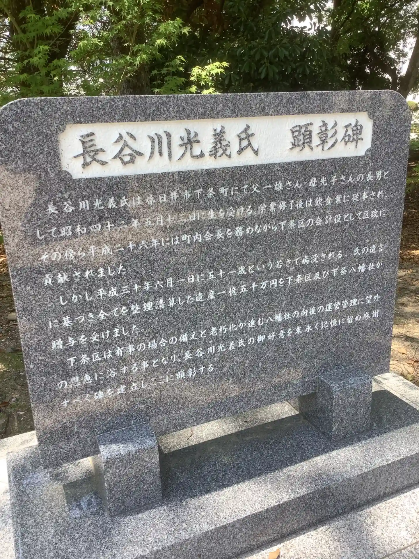 長谷川光義さんの遺産の一部が八幡社の運営に寄付されたと顕彰されています。