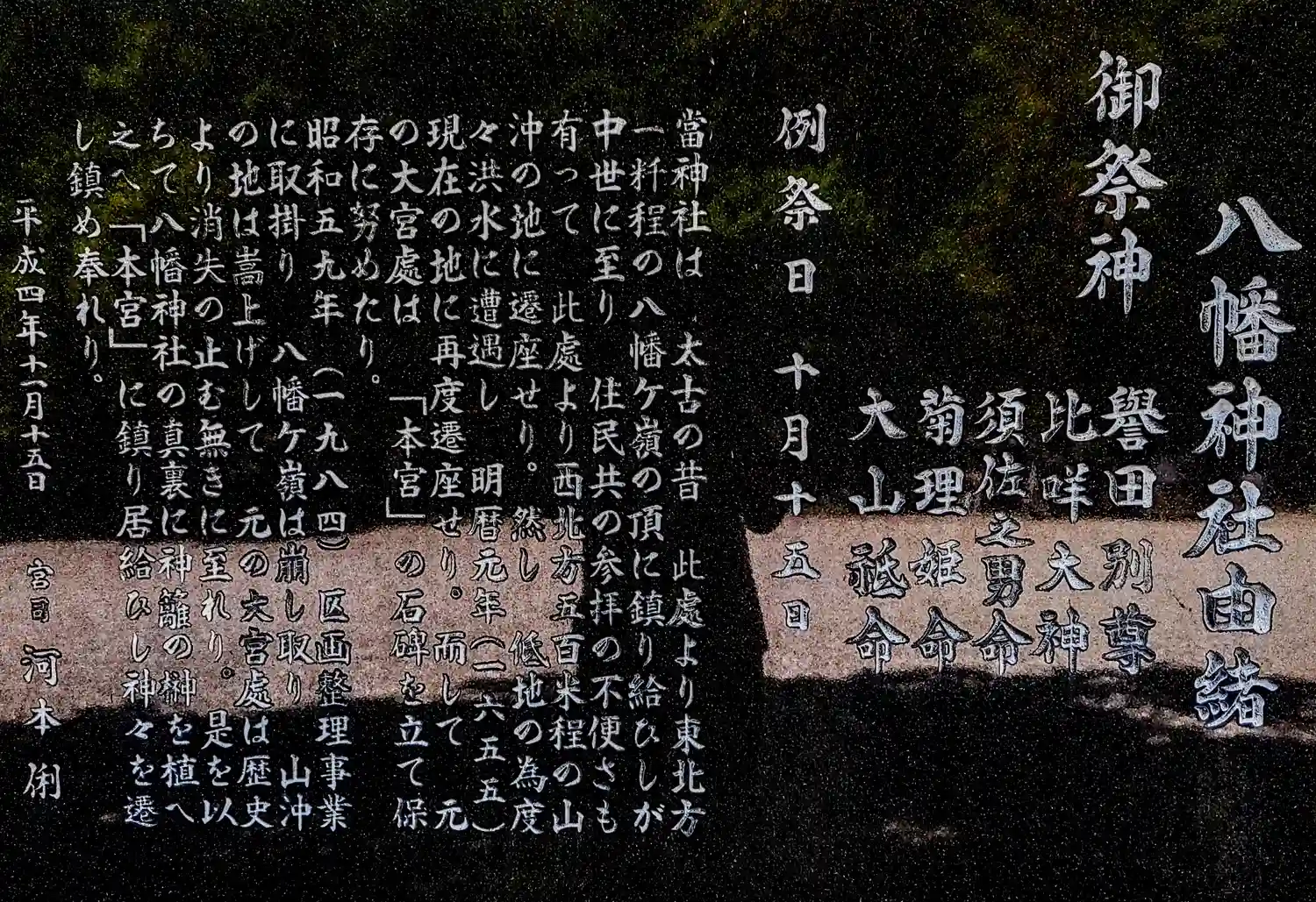 | ご祭神 | 譽田別尊 、比咩大神、須佐之男命、菊理姫命、大山祗命 |