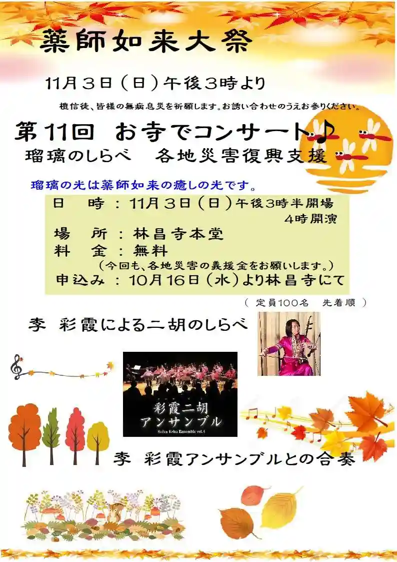 今週末11月3日(日)15:00~、林昌寺にて薬師如来の縁日の法要があります。