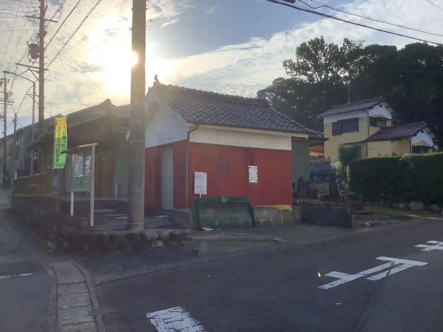 えんじ色の建物は消防倉庫だったと思われる。
