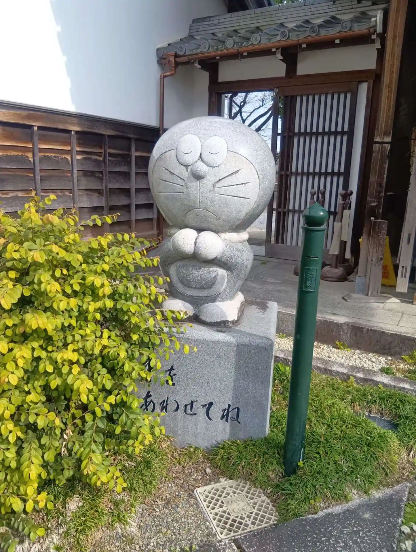 愛知県江南市北部、曼陀羅寺境内に鎮座する「世尊院」を参拝させていただきました。山門をくぐるとすぐ右手に、手を合わせたドラえもんの石像がありました。