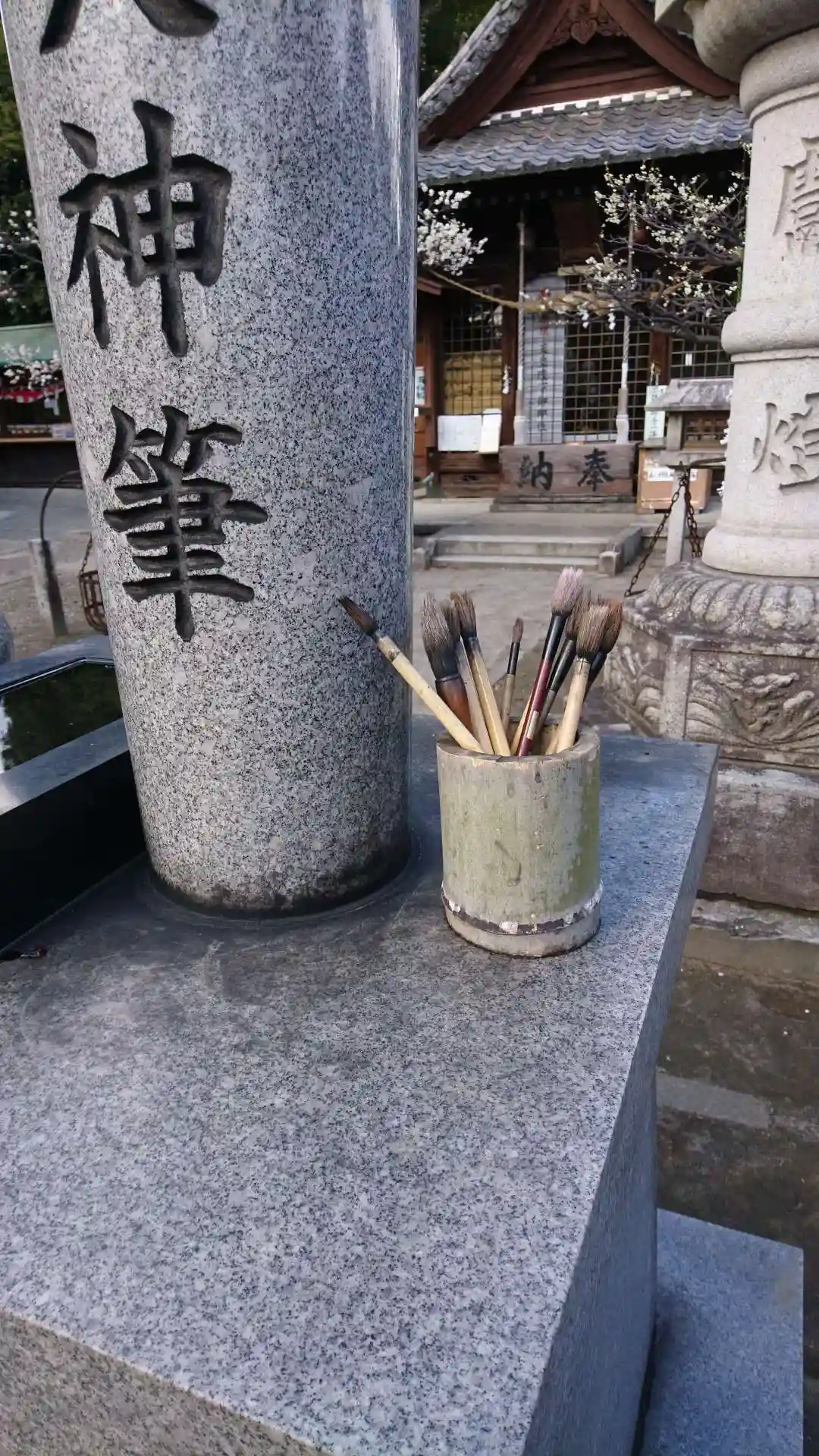 拝殿と筆の石像