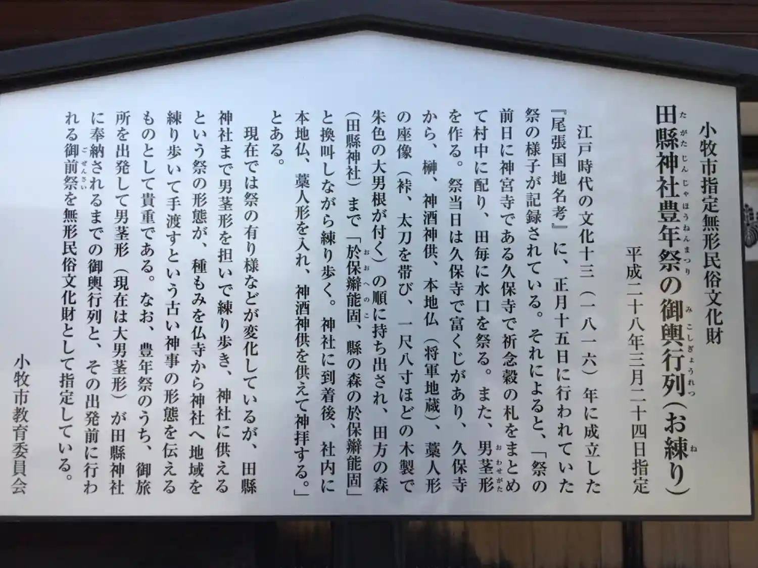 愛知県小牧市の神社て、名鉄小牧線の田県神社前駅から徒歩5分位です。