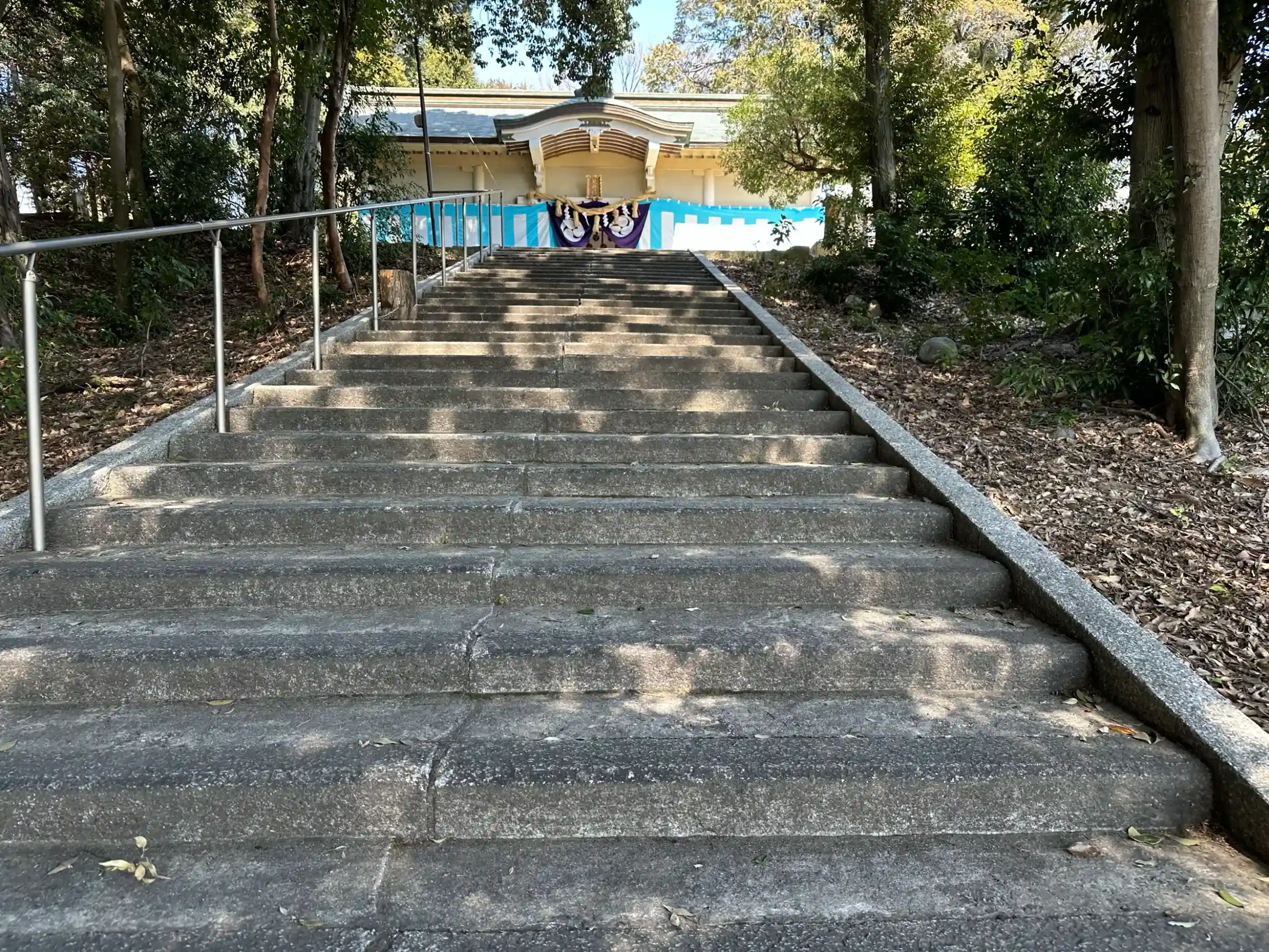 豊年祭は前述の通り御旅所が2ヶ所あるため、田縣神社との道のりがその渡御の通り道となります。神明社は平地で住宅街の中を通るような道のりですが、熊野からの道のりはまず急な階段の表参道を降り、鳥居を過ぎればこちらの坂道を進みます。そして田縣神社の間に名鉄線の線路があるため、電車が来ないタイミングで行列は渡る必要があり、難易度が上がります。