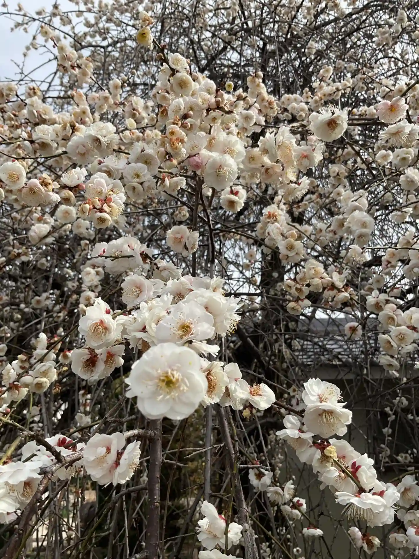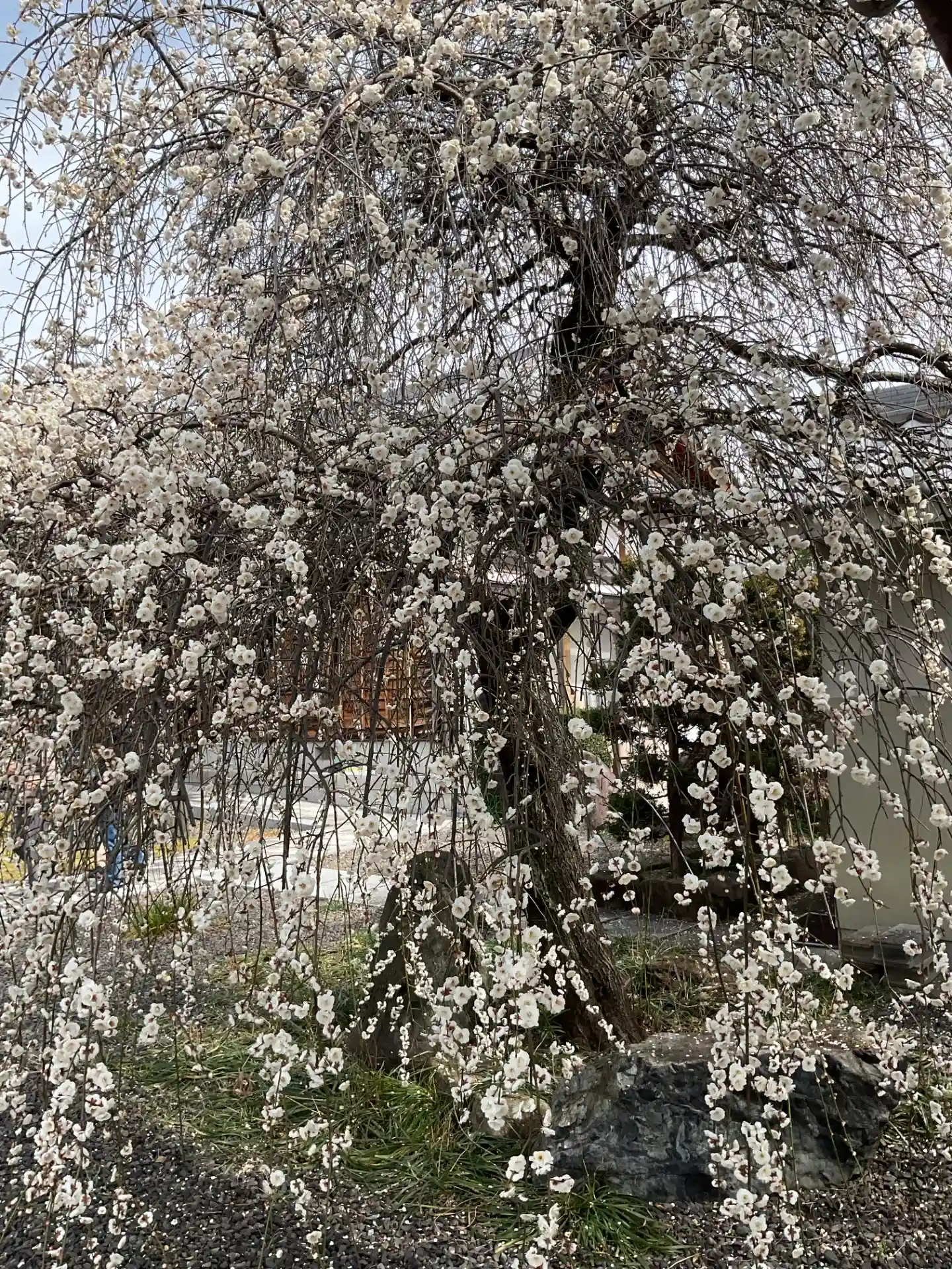 山門と本堂の間にある大きな枝垂れ梅白花が満開でし…