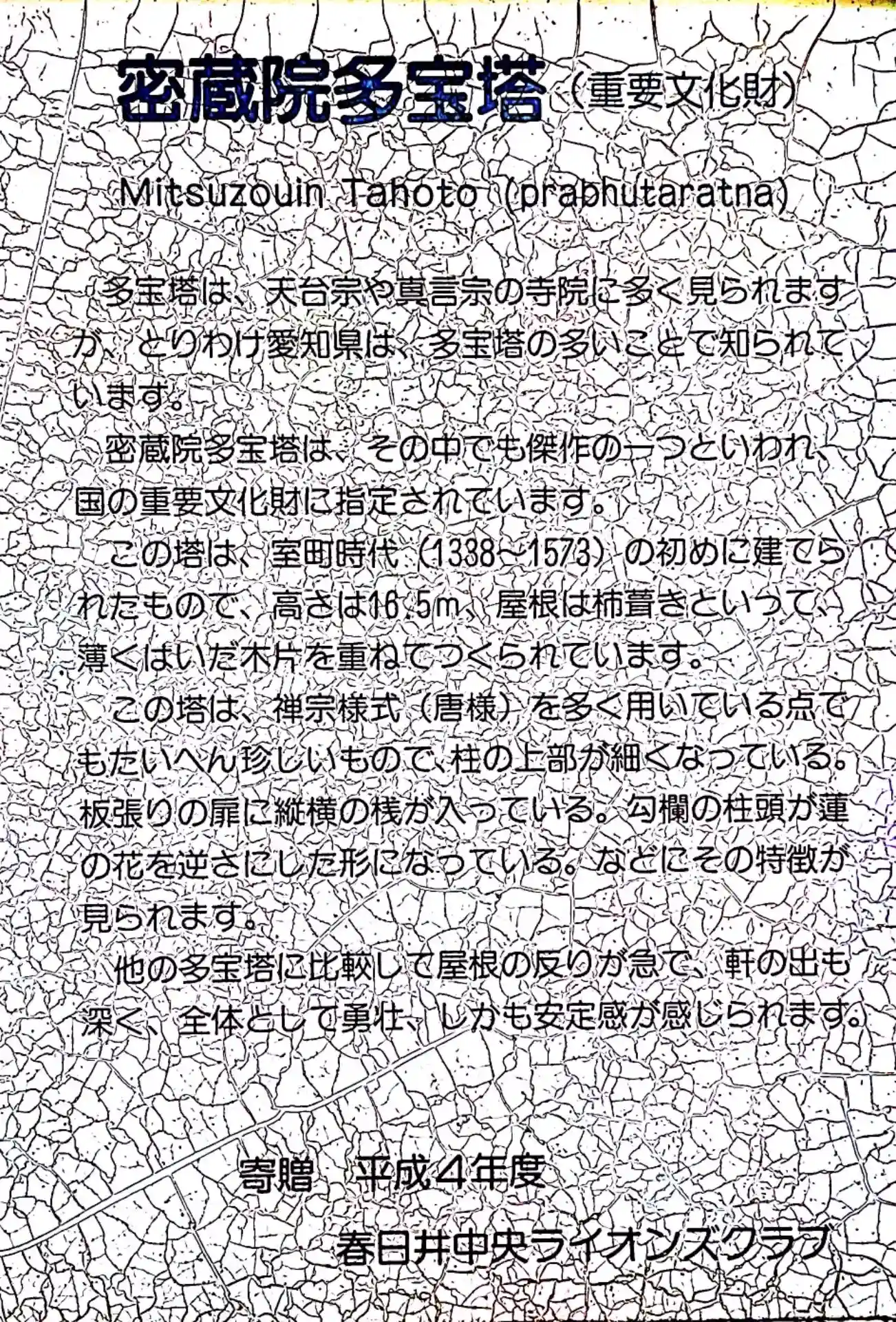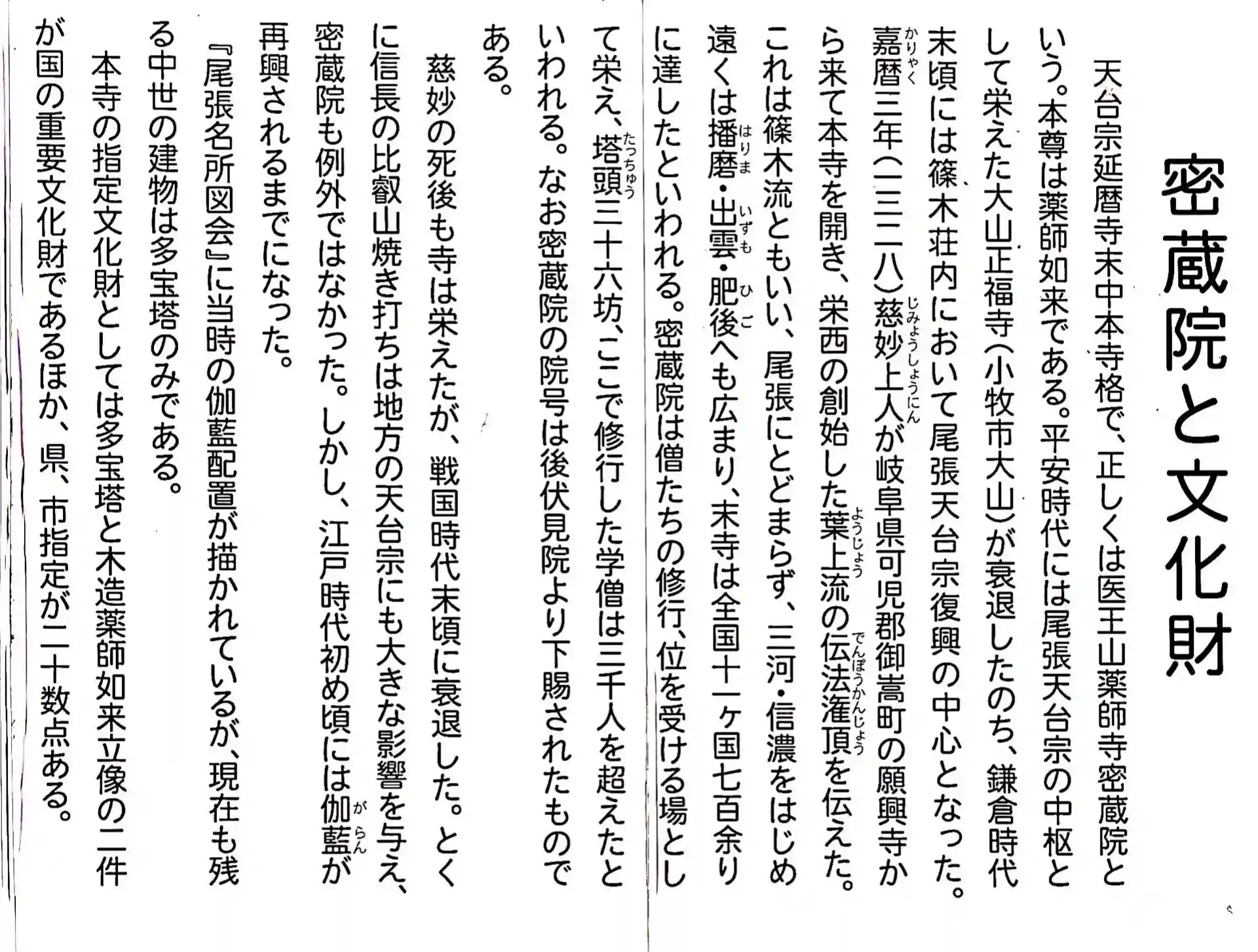 1328年、開創。尾張地方に於ける天台宗の中心地となります。1441年前後に最盛期を迎え、末寺は尾張・美濃を中心に1700寺、塔頭は36坊にものぼり、七堂伽藍も備わって道場として当時の学徒は3,000人を超えたとされています。