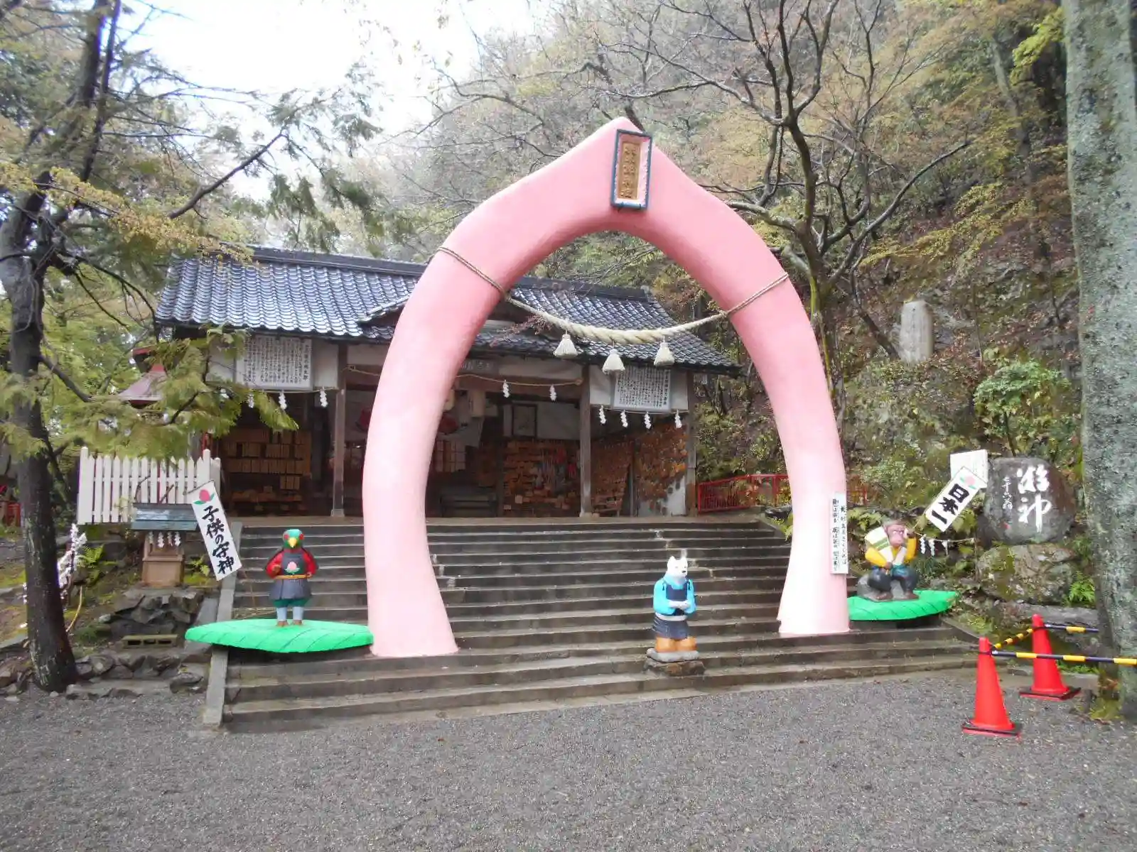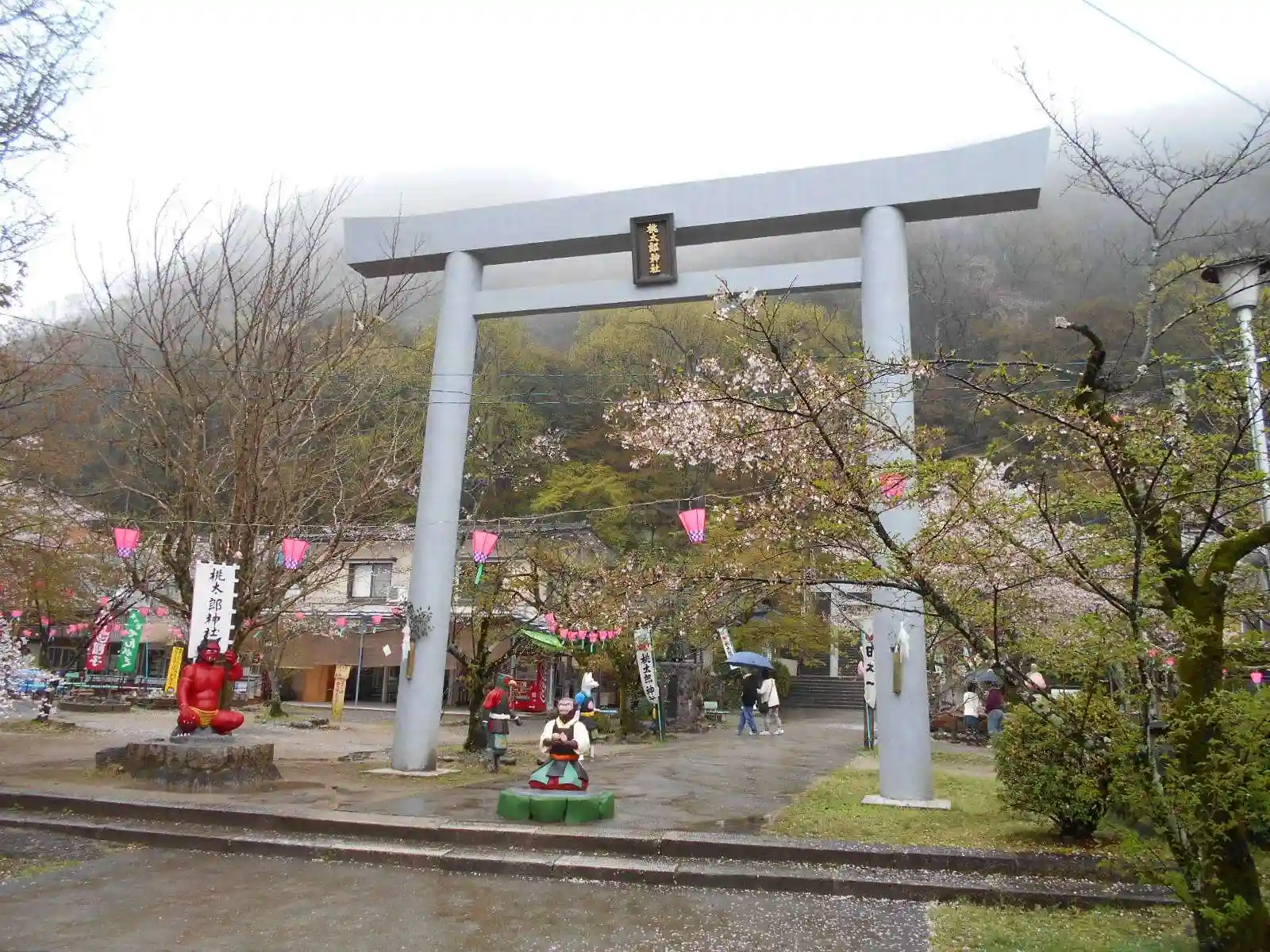 二の鳥居。鳥居の真正面は、桃太郎。