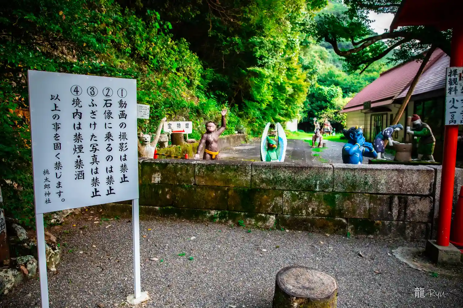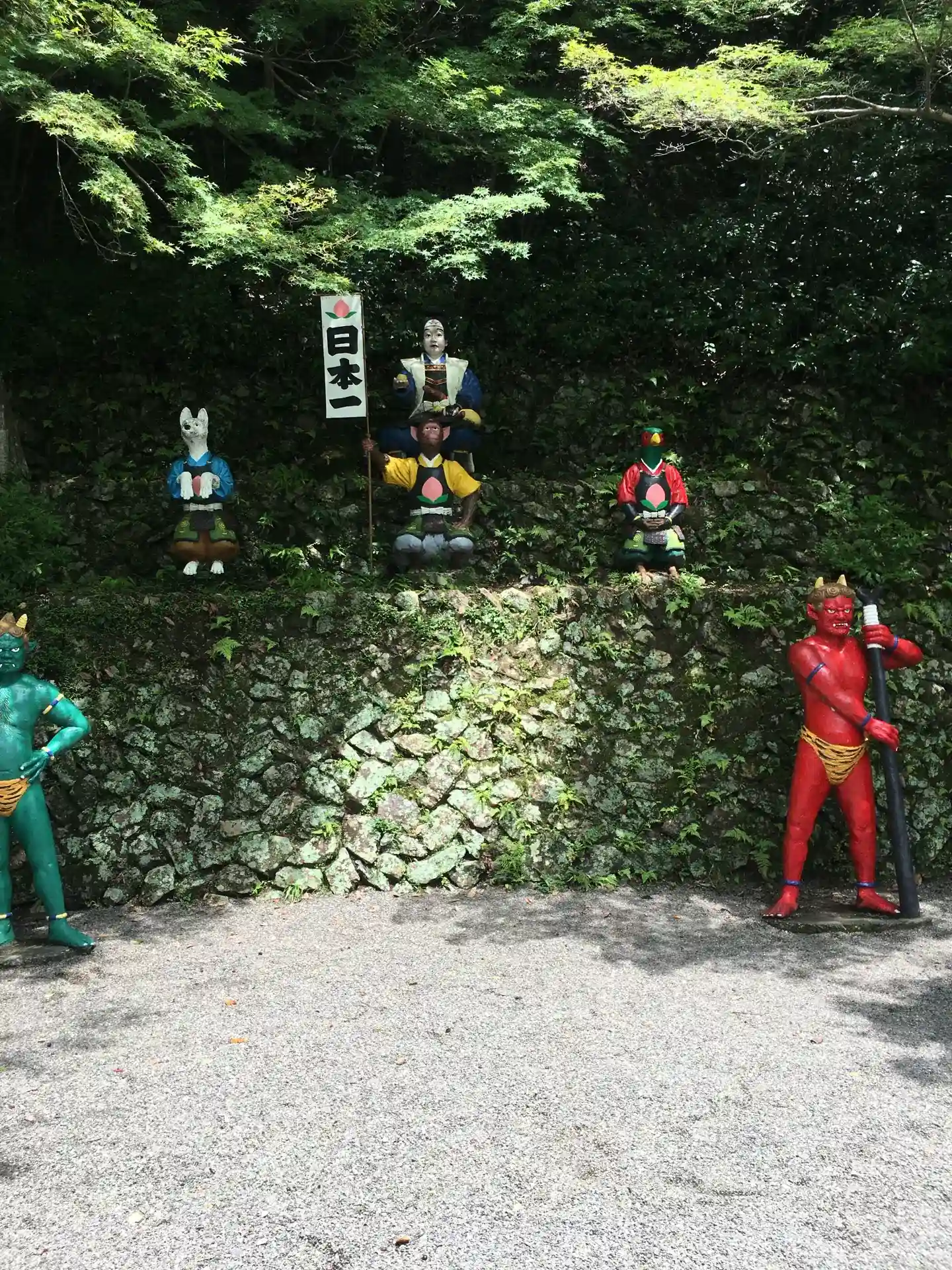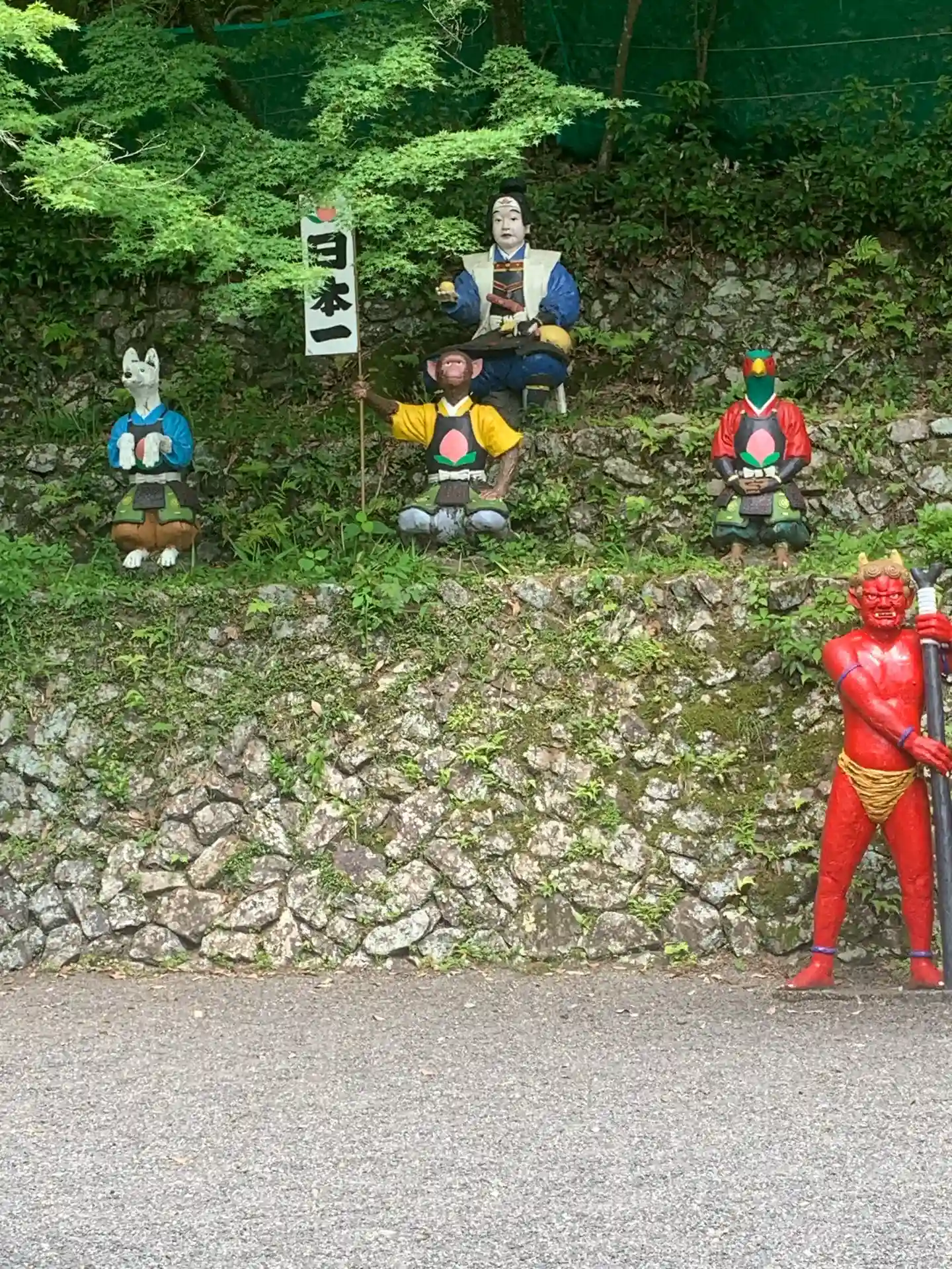 桃太郎や仲間などのユニークな石像がたくさんあります。