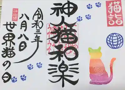 見開きの御朱印です。近年、猫を目当てに遊びに来られる方々が増えましたので、「猫詣」「神人猫和楽」とさせていただきました。日付けは猫の日に因み2月22日とさせていただきます。