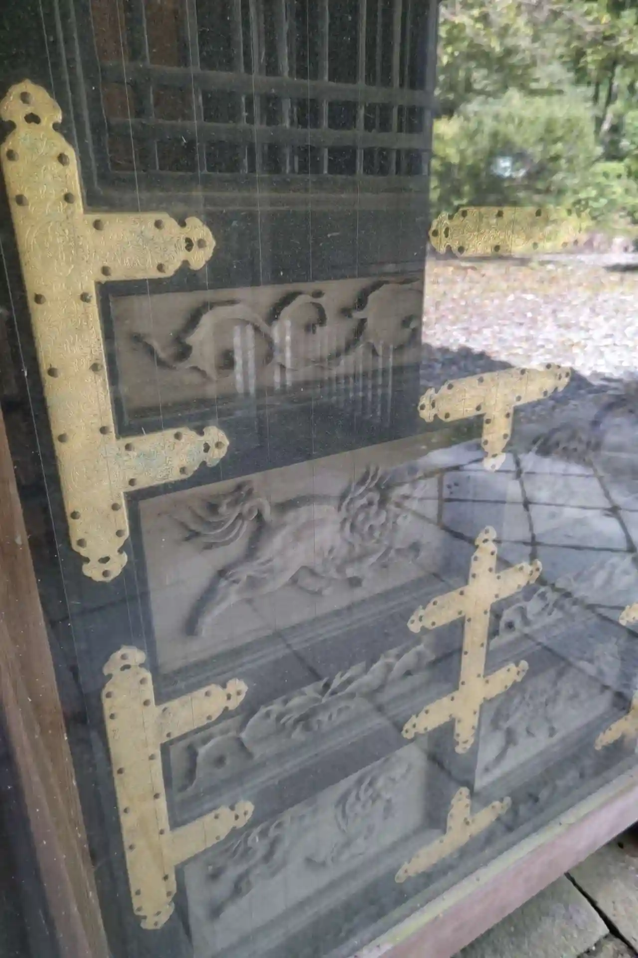 門の彫刻です。ガラスが反射して見にくいですが、左甚五郎作と言われています。ホントかな?