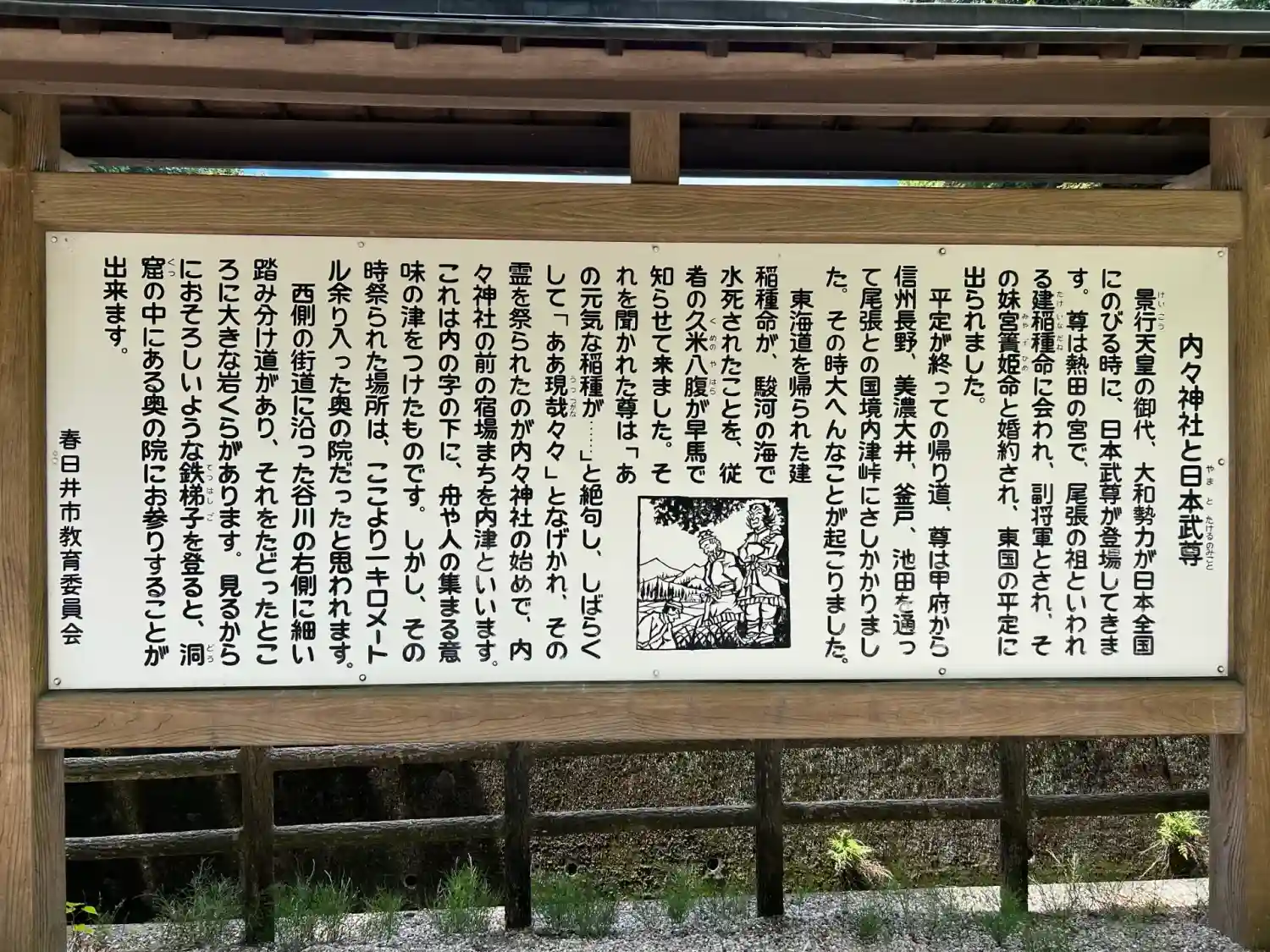楽しみ方創建年代については不詳であるが、延喜式に記載された式内社である。 東国の平定を終えた日本武尊が内津峠に差し掛かった時、早馬で駆けてきた従者の久米八腹(くめのやはら)から副将軍である建稲種命が駿河の海で水死したとの報告を受けた。それを聞いた日本武尊は「ああ現哉々々(うつつかな)」と嘆き、その霊を祀ったのが内々神社の始まりという。