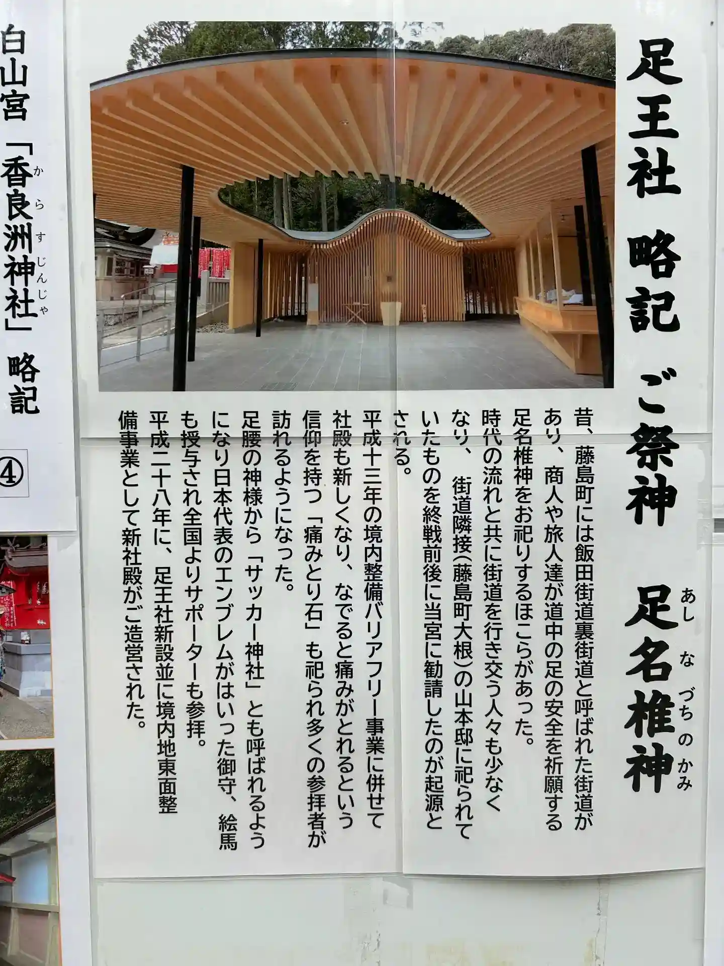 境内社の足王社は、御祭神が足名椎神で足腰の神様。サッカー日本代表のエンブレムの入った御守りや絵馬が頒布されています。