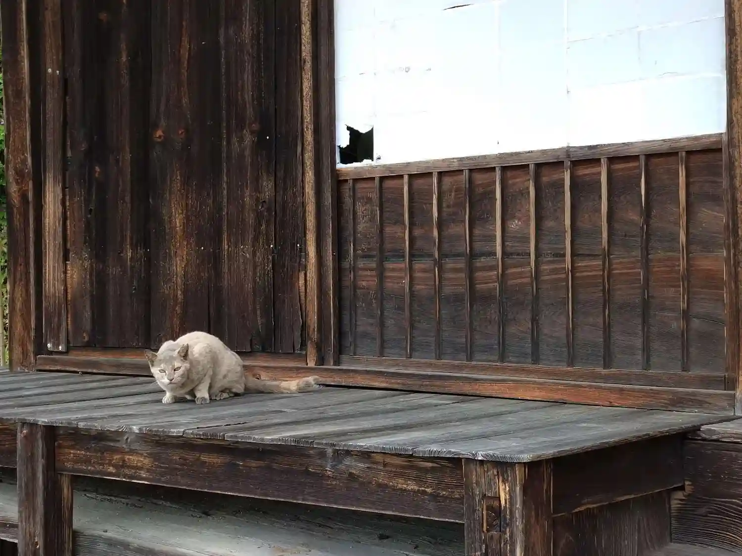 こちらの本堂を歩いていた猫ですが、突然破れた障子から飛び出てきました。その後こちらをにらんでいまし…