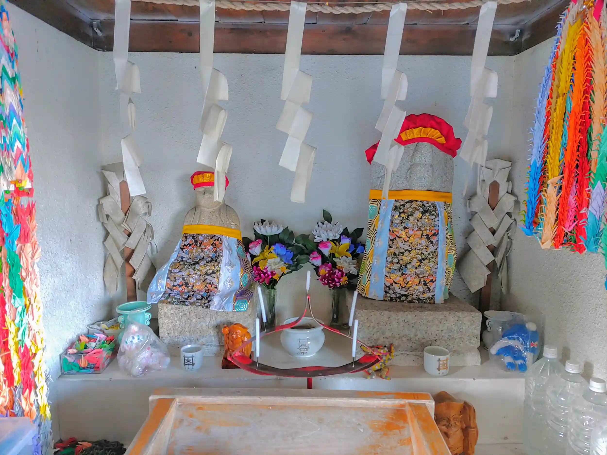 道路沿いにあるお地蔵さん。大正時代「水かけ地蔵」として祀られていたみたいだけど、いつしか忘れ去られ、昭和の戦後、「お助け地蔵」として復活したお地蔵さんです。千羽鶴、おべべ、お花、お水などなど、信仰の高さが見て取れます。