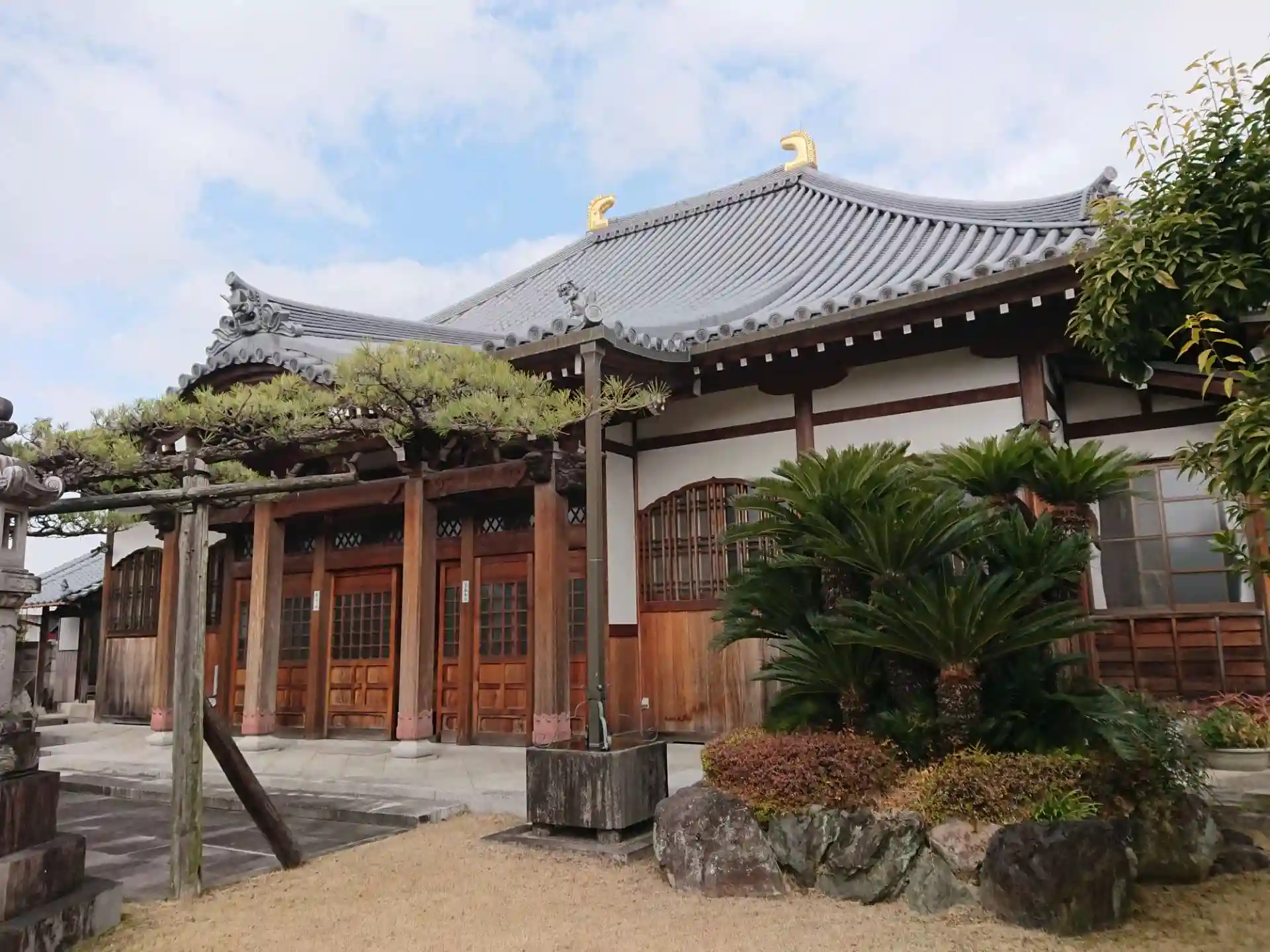山門の奥に本堂前で横に伸びる松が立派です。