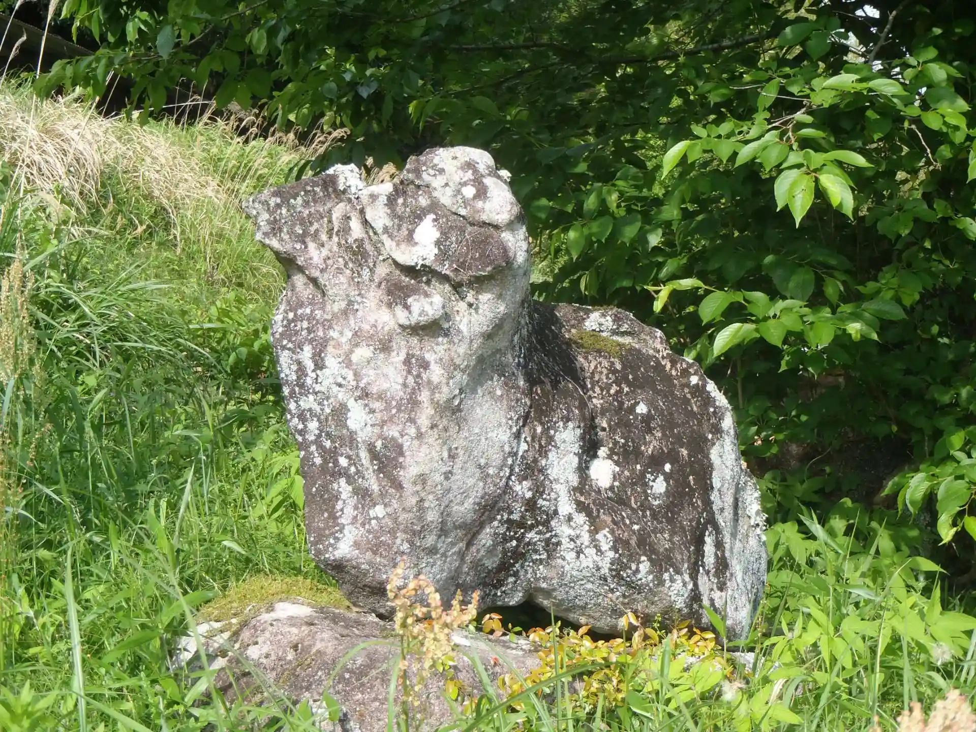 豊田市東部の神社巡り(豊田市坂上町):少々山を下り、集落の中心地でしょうか、周囲に民家が増えてきました。道沿いの鳥居から社殿は見当たりません。草を分けて「こっちかな?」と思いつつ本日2回目の「プチ登山」となりました。