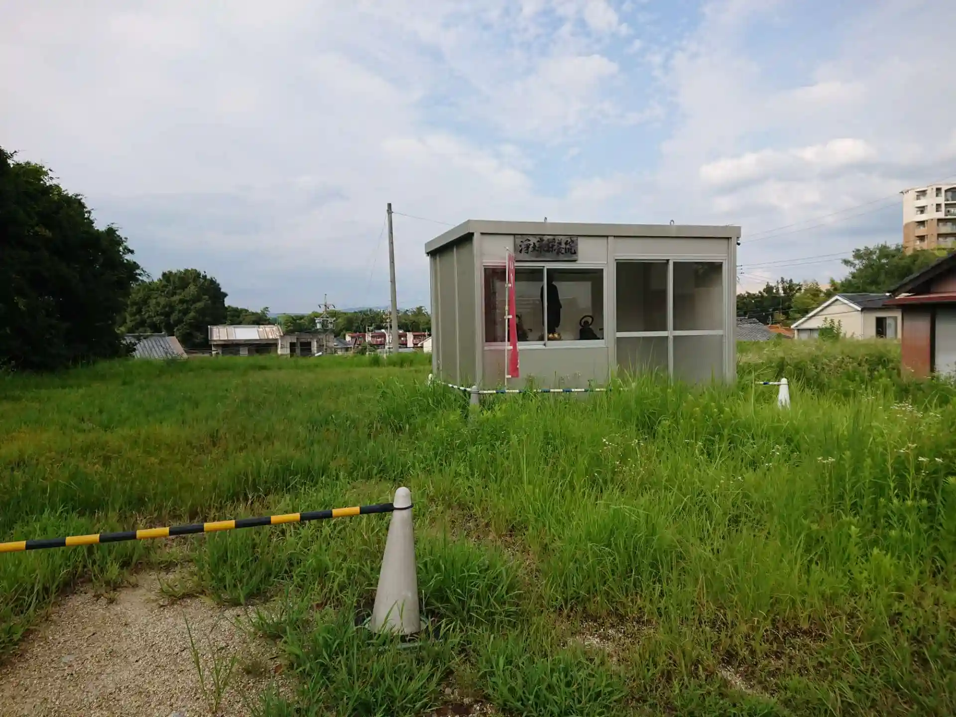 駐車場の看板を見かけ車を停めて、参道の案内看板に従って行った先には、本堂も山門もなにもありません。驚いたのはプレハブ!なぜ何もないのかわかりません。