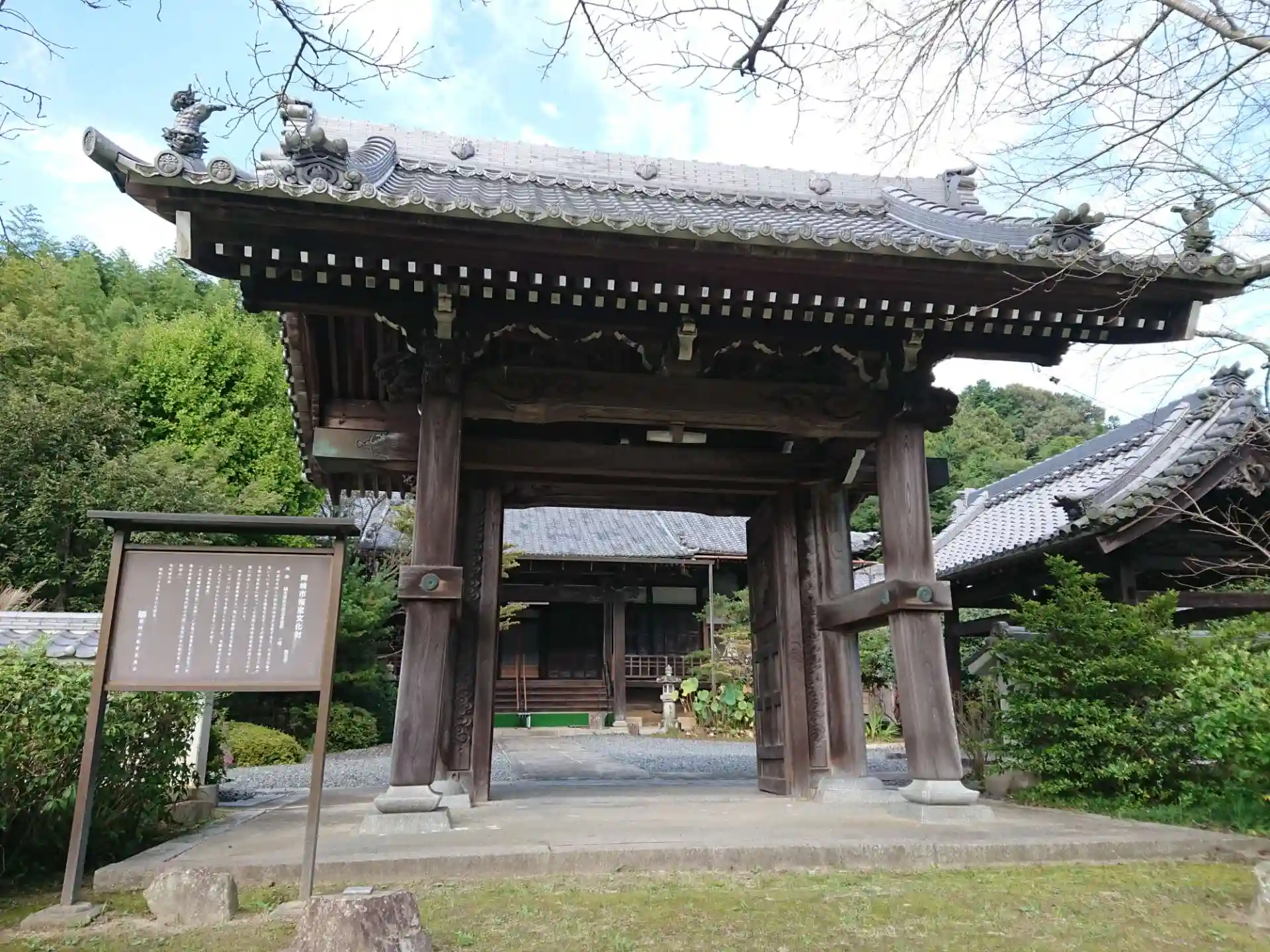山間部の通り沿いに山門が見えます。山門の奥には立派な本堂があります。