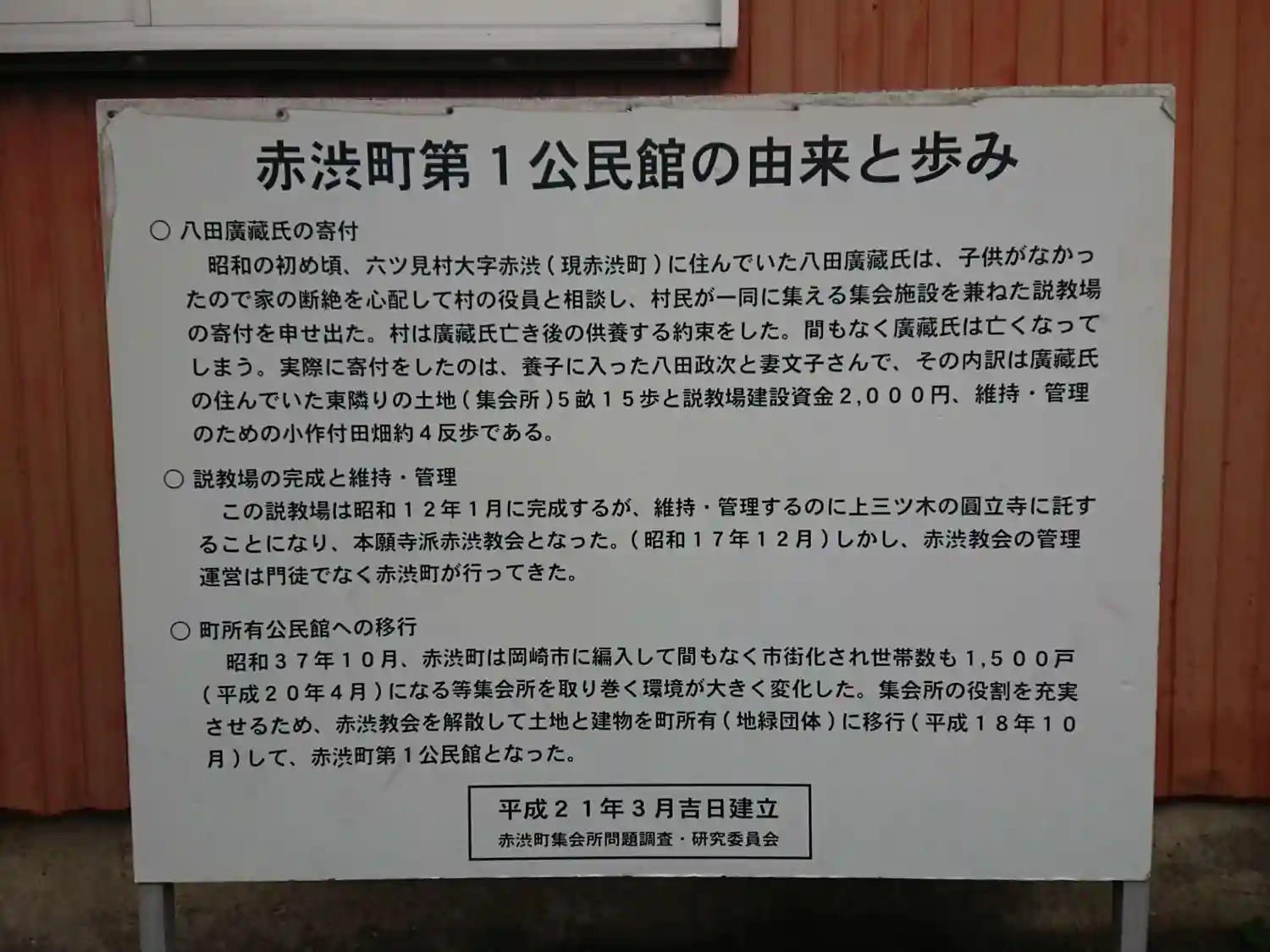 赤渋教会は平成18年10月に解散し、赤渋町第1公民館となりました。