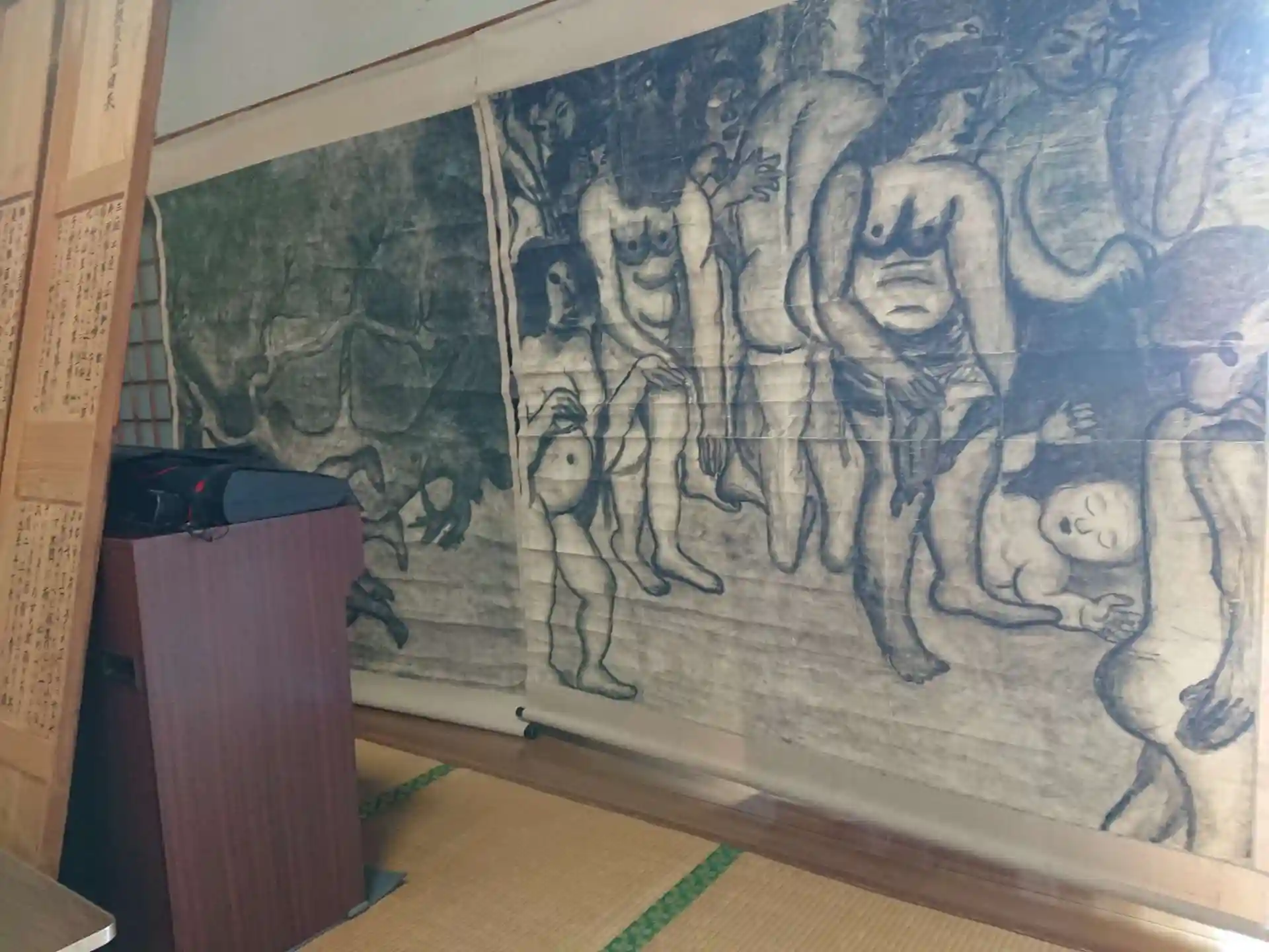 今年も徳応寺で「原爆の図」が公開されています。被爆直後の広島を描いた丸木位里・俊夫妻の作品を、60年ほど前に、終戦の年に生まれた男川小学校の児童が忠実に再現しました。水墨画で炎に苦しむ人達が描かれています。
