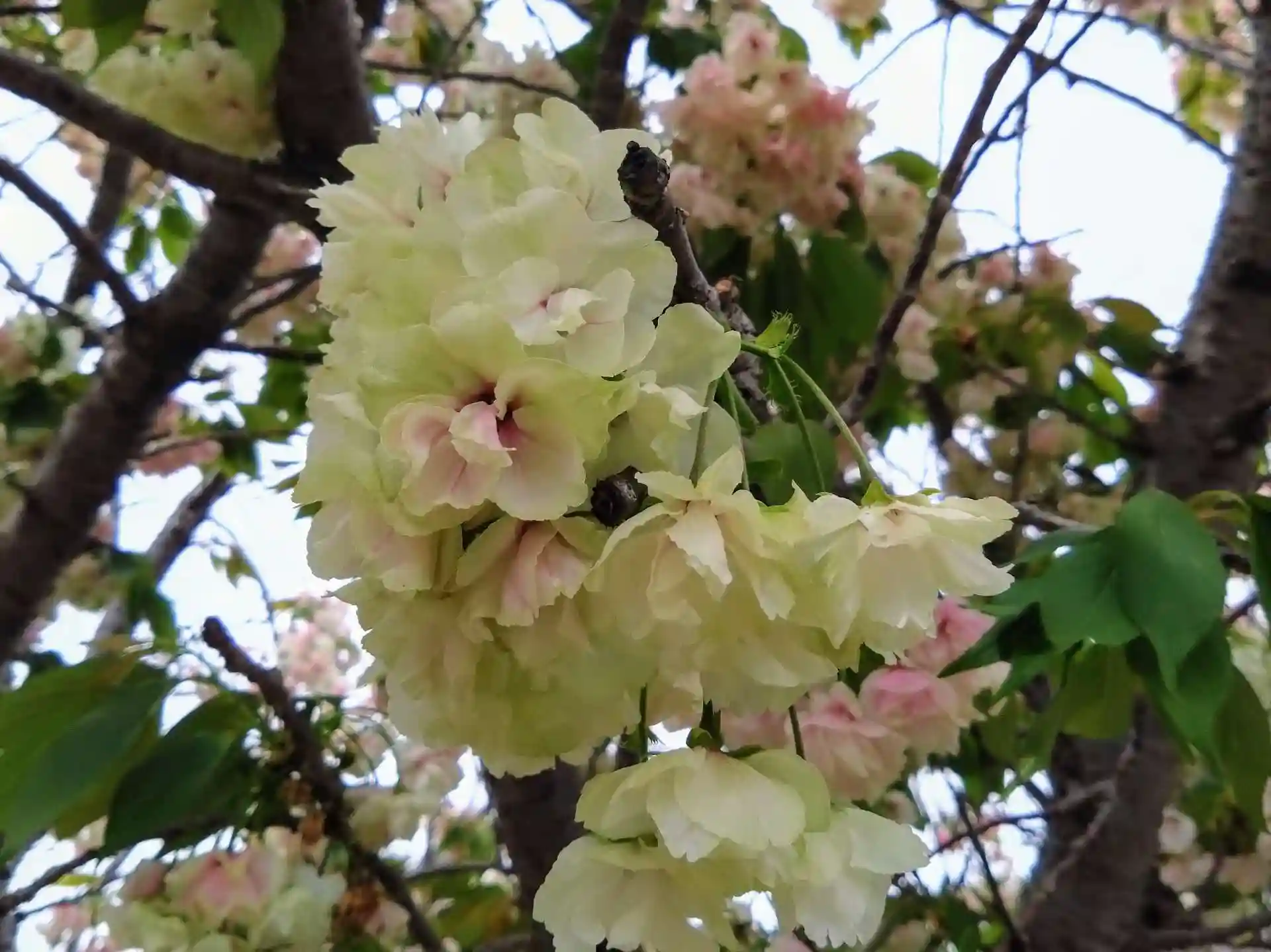 以前訪れた時には気づきませんでしたが、境内の端に黄緑色の桜が咲いていました。鬱金桜でしょうか?花が咲いてないと全然わかりません。
