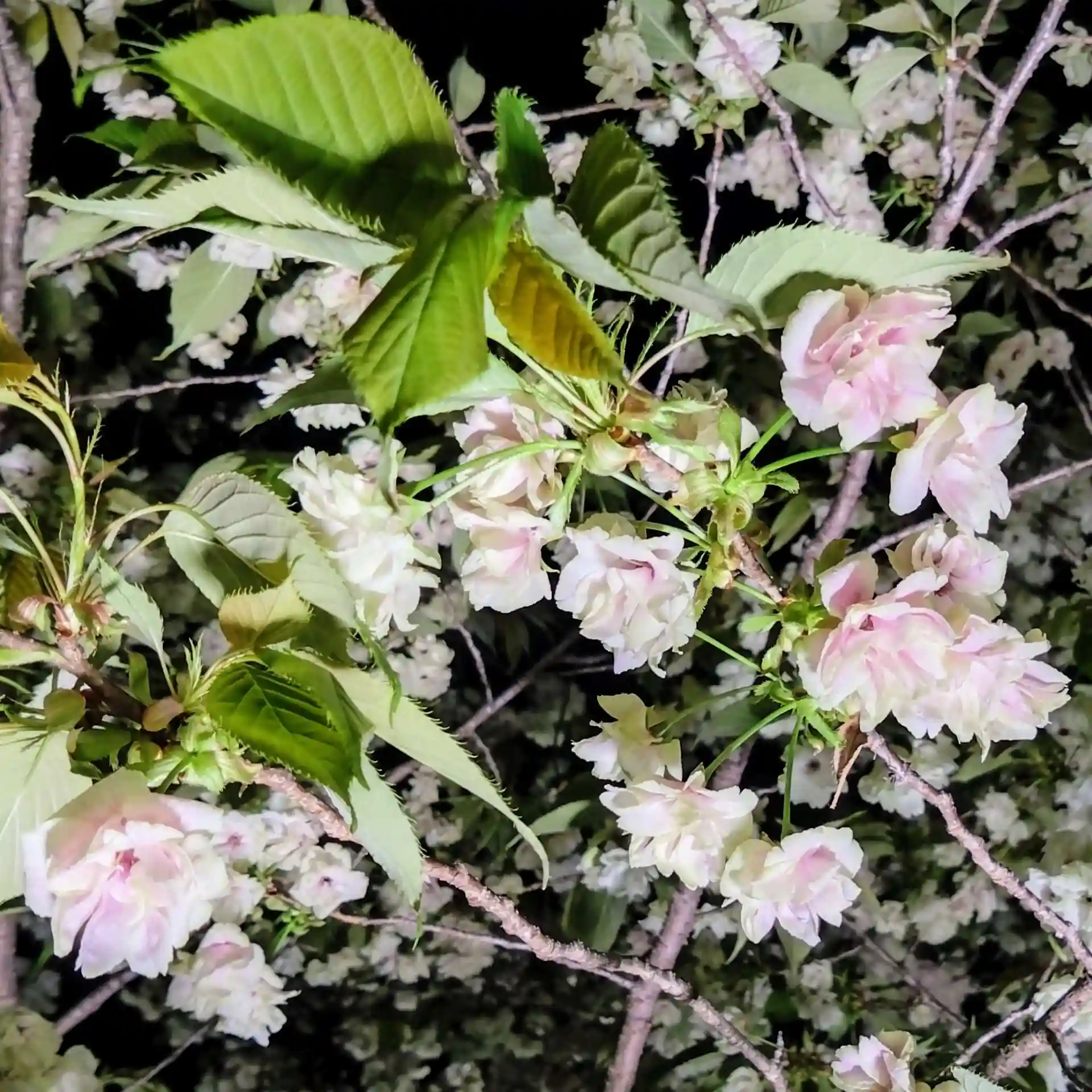 昨日とは違い天気がよかったので、鬱金桜のライトアップ時間に滑り込み。ライトアップが綺麗でした。