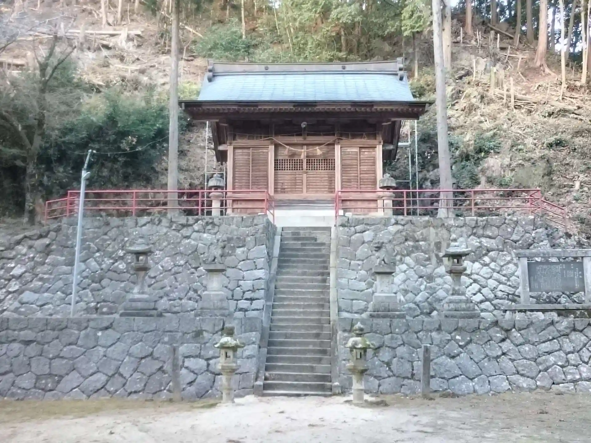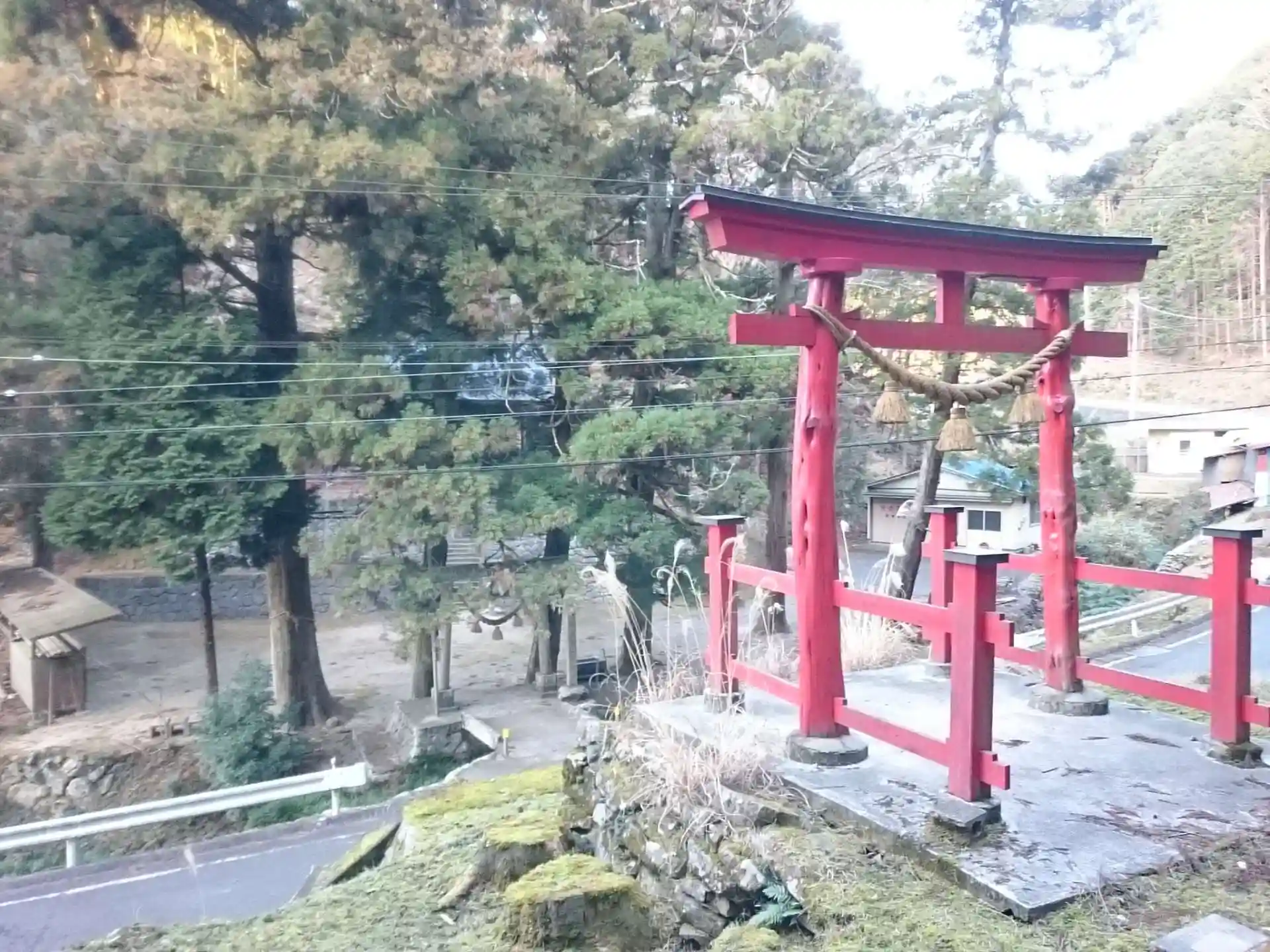 小川を越えた向こうに本殿があります。でも朱色の鳥居は道路を挟んで、高台にあるため鳥居をくぐってまっすぐいけません。なぜでしょう?