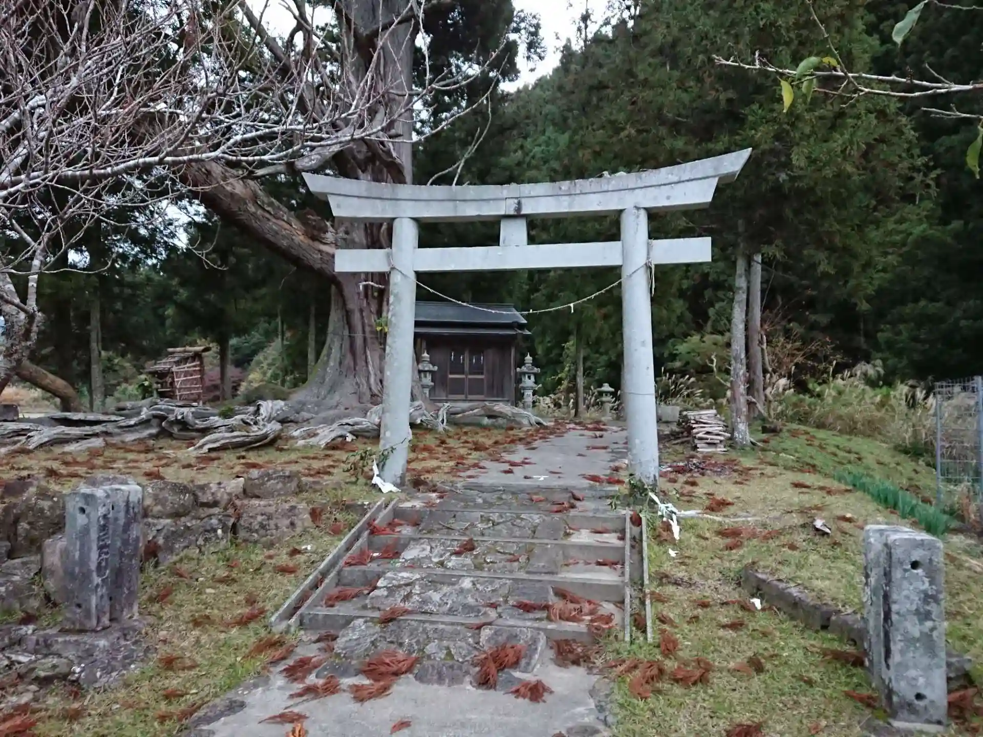 道沿いにあり簡単に立ち寄ることができます。境内の大スギは、樹齢推定800年の巨木です。