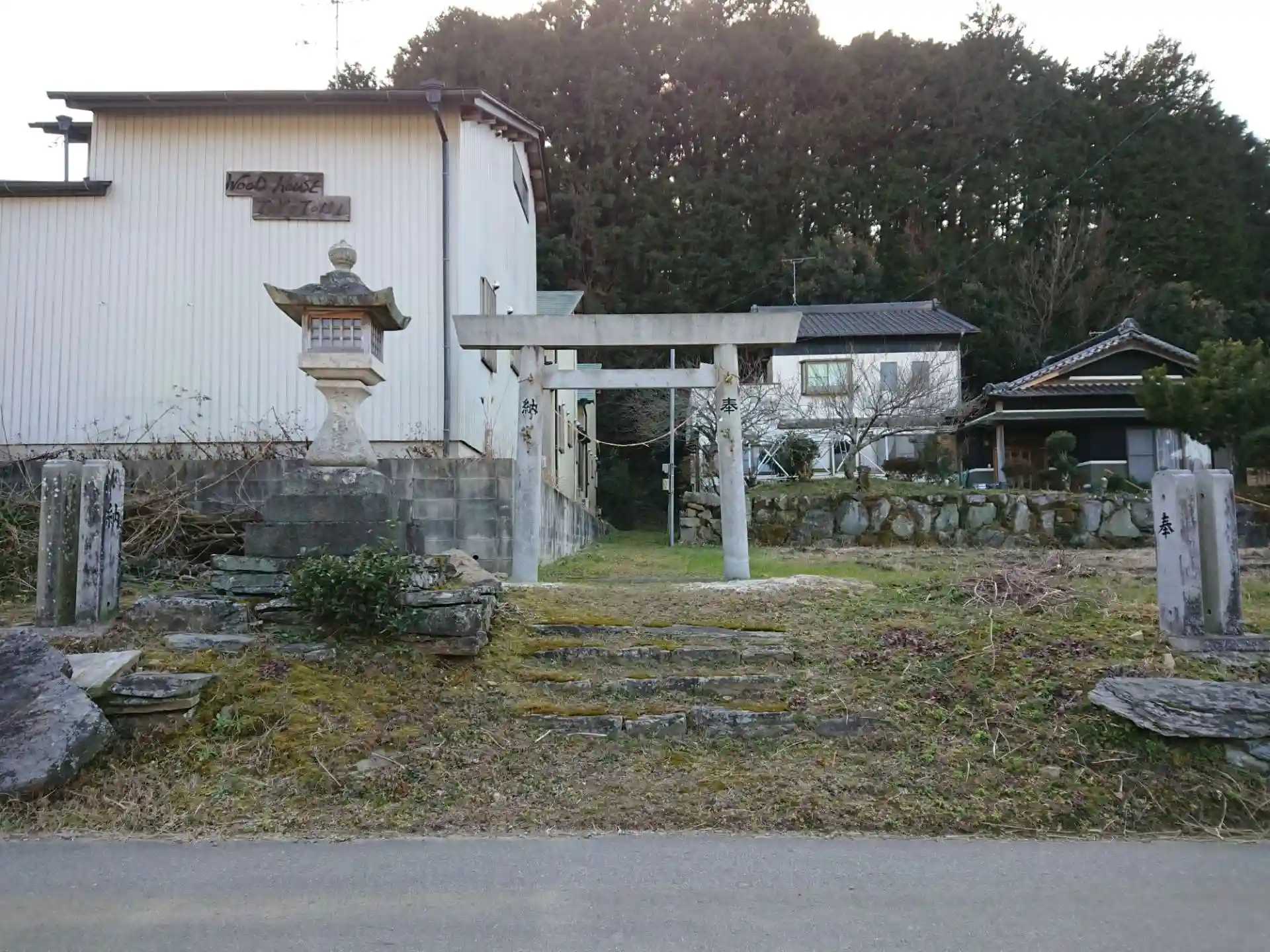 住宅の間を通って、この地域ではたくさん使われている石でできた階段を上った先に社殿があります。