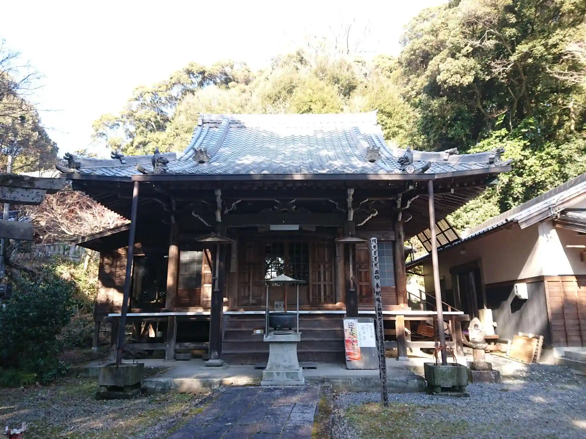石段の先に本堂があります。さらにもう少し坂道を上ると救世観音八角堂があります。