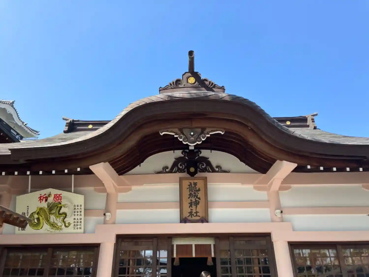 拝殿の天井には、国内最大級の白木彫りの昇龍があります。
