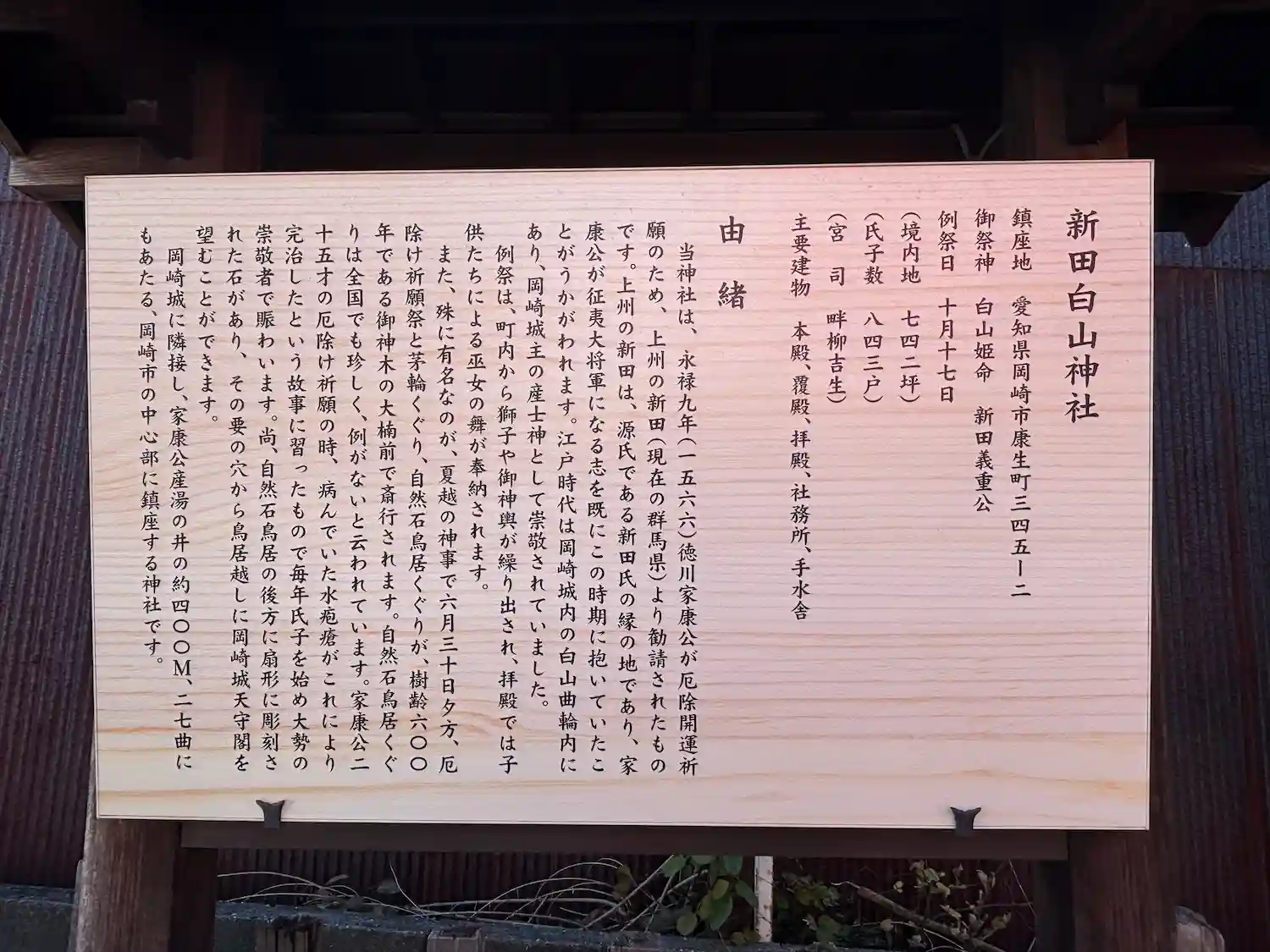 | ご由緒 | 新田白山神社は、永禄9年(1566)徳川家康公が厄除開運祈願のため、源氏である新田氏ゆかりの地である上野国(群馬県)の新田より勧請したもので(ご祭神は白山姫命と新田義重公)、江戸時代以降、岡崎城の拡張整備に伴い白山曲輪内に引き込まれて、代々の岡崎城主の産土神として崇敬されました。