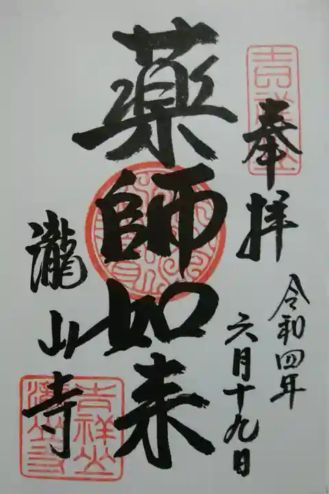 瀧山寺縁起によれば、朱鳥元年(686年)奈良時代の伝説的な山岳修行者、小角(おづぬ)が青木川の滝壺から薬師如来を拾い上げ、安置するために「吉祥寺」という一堂を建てたのに始まると言われる。小角は自ら薬師如来像を彫刻し、その仏身に金色の薬師如来を納め御堂に安置しました。