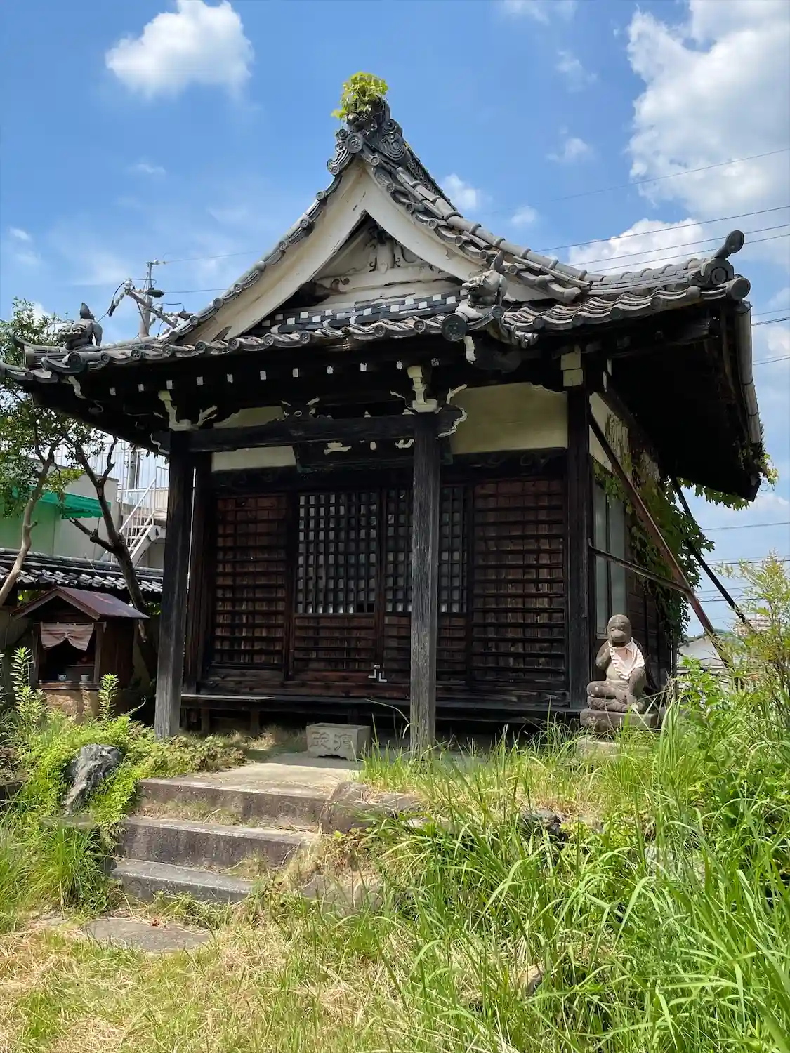 お堂の劣化具合、雑草の生え具合、あまり管理されてない感。活気も無い。人もいない。