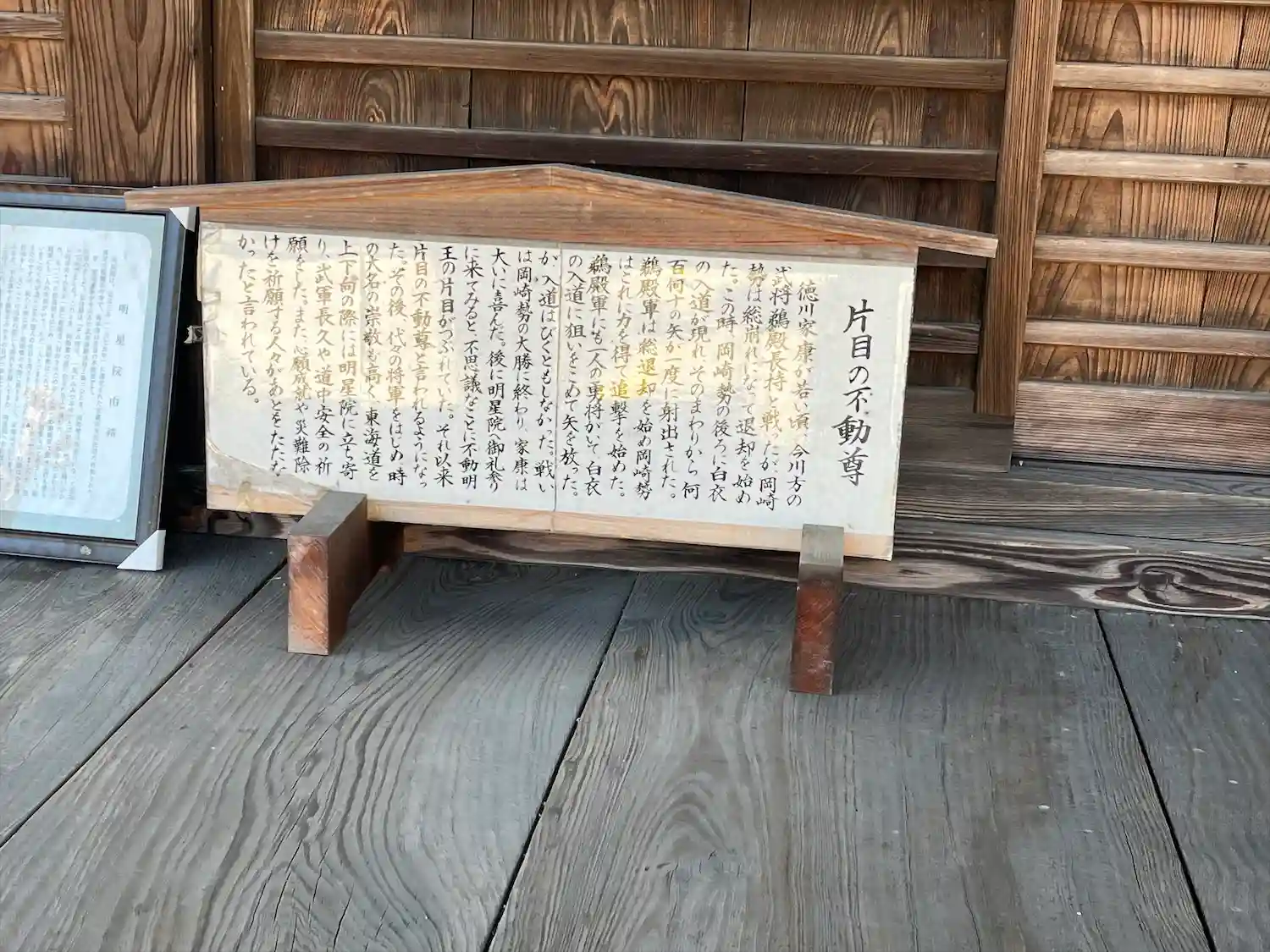 後に明星院へ御参りに来てみると、不思議なことに不動明王の片目がつぶれていた。それ以来片目の不動尊と言われるようになった。