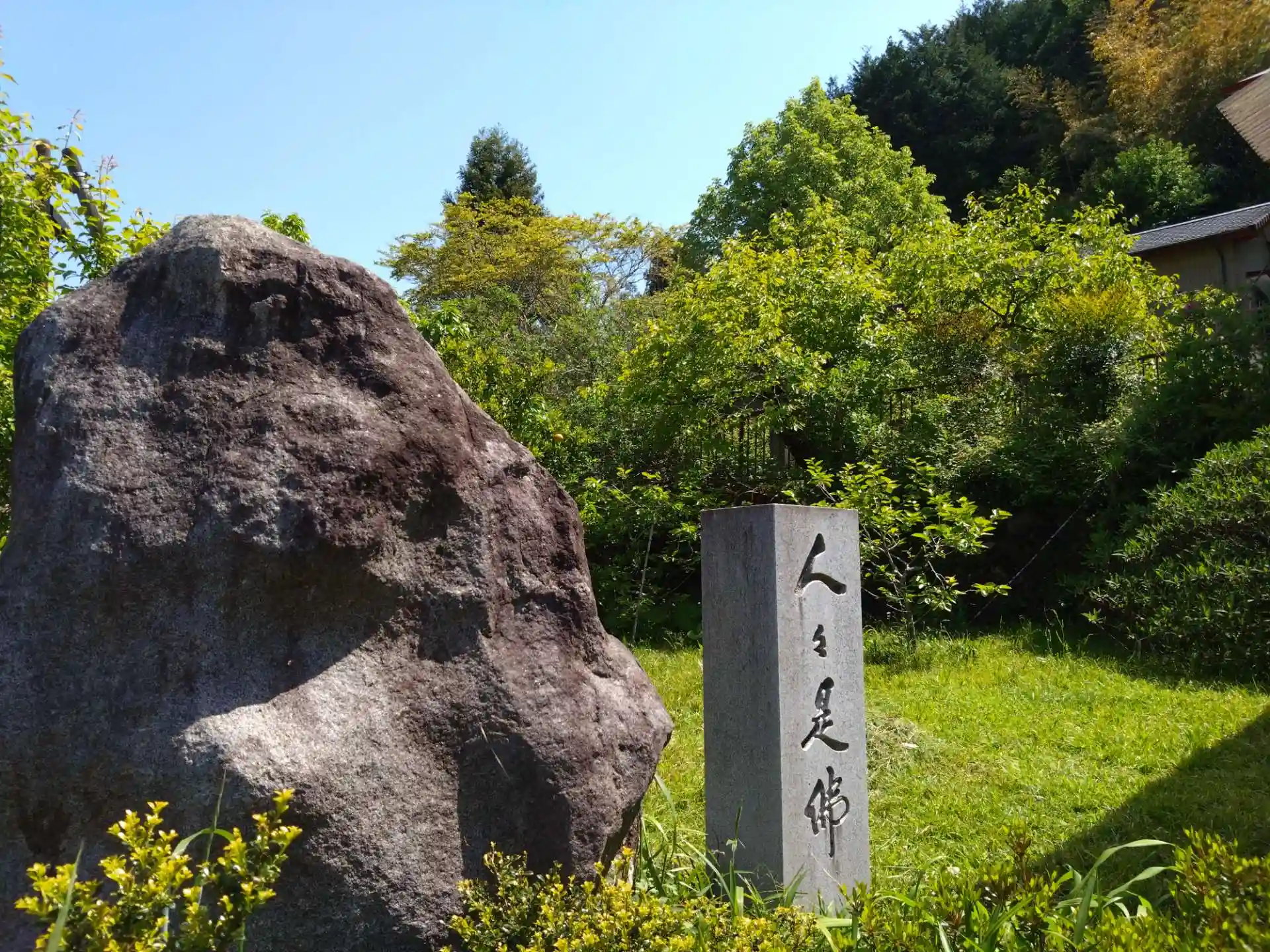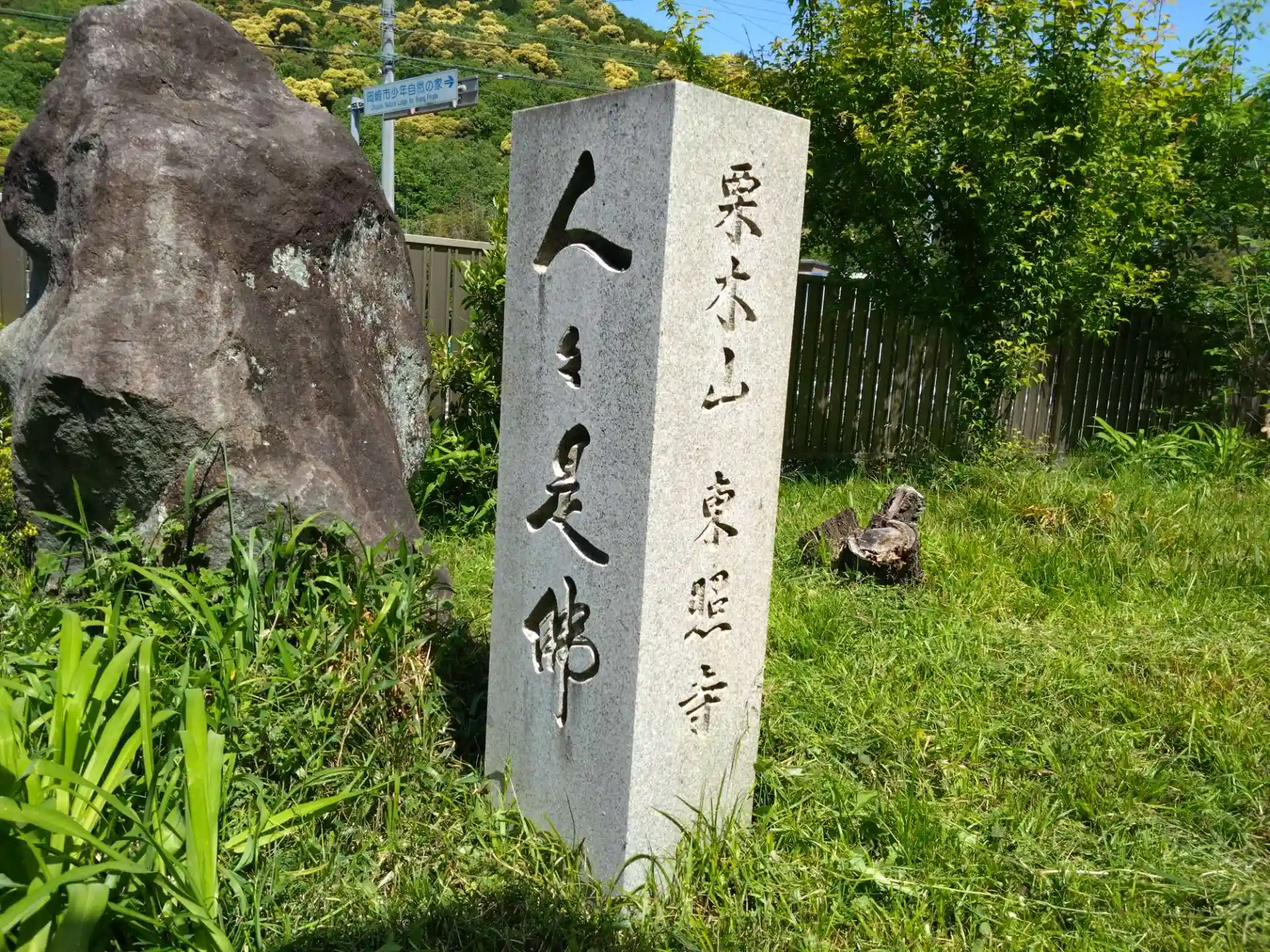 気づきにくい寺標がありました。奥に入ると民家の玄関前と庭を通って本堂まで行けそうですが、ちょっと抵抗がありました。木々のすき間から建物が少しだけ見えました。