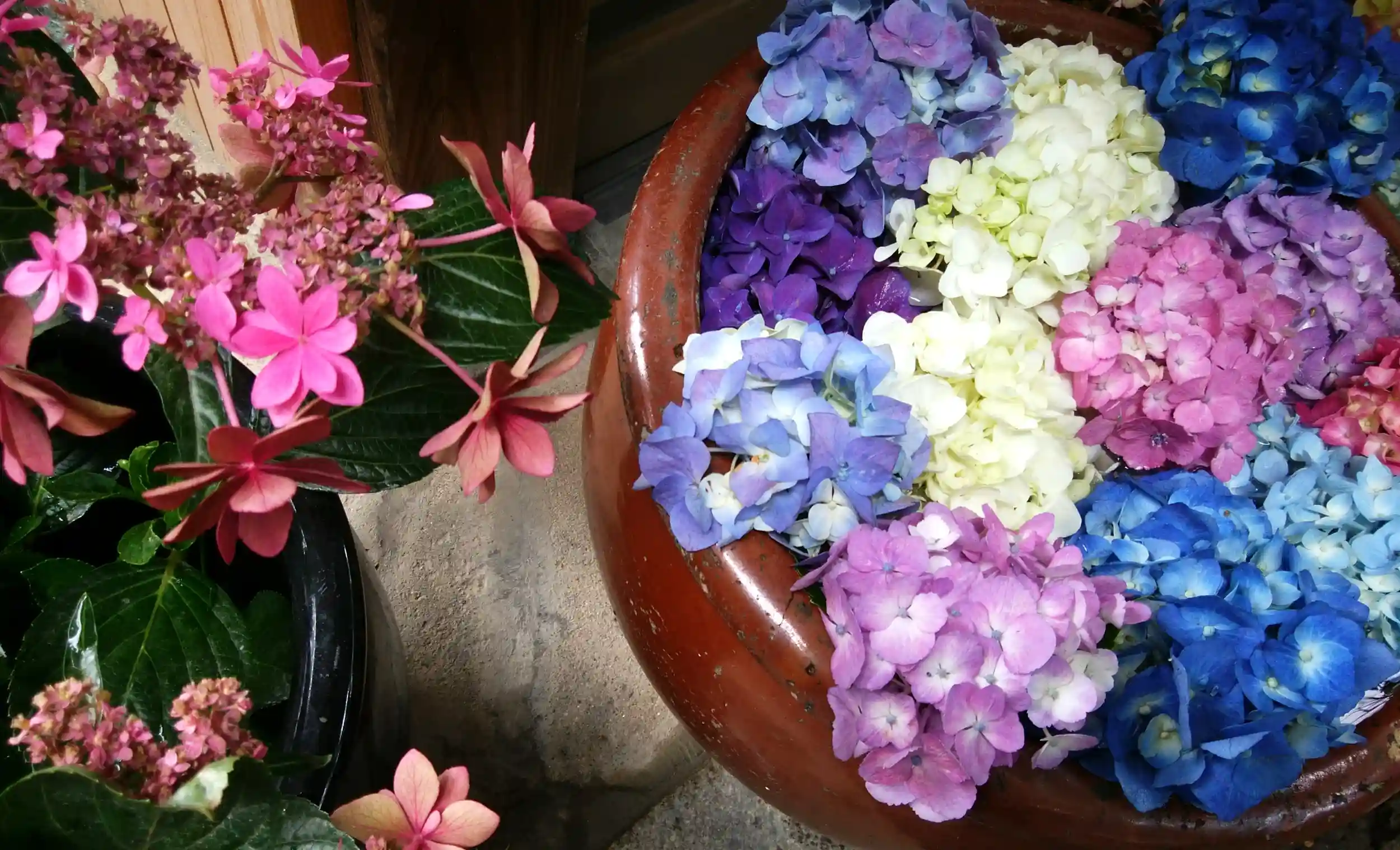カラフルな手水鉢が印象に残る
