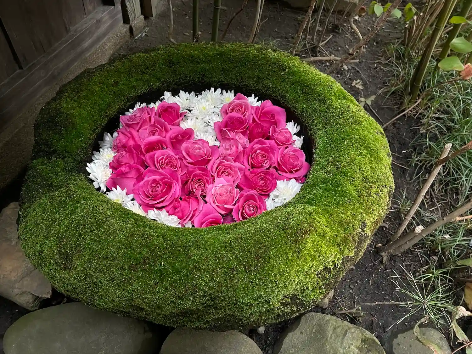 苔の花手水。ピンクの❤️が可愛い😍