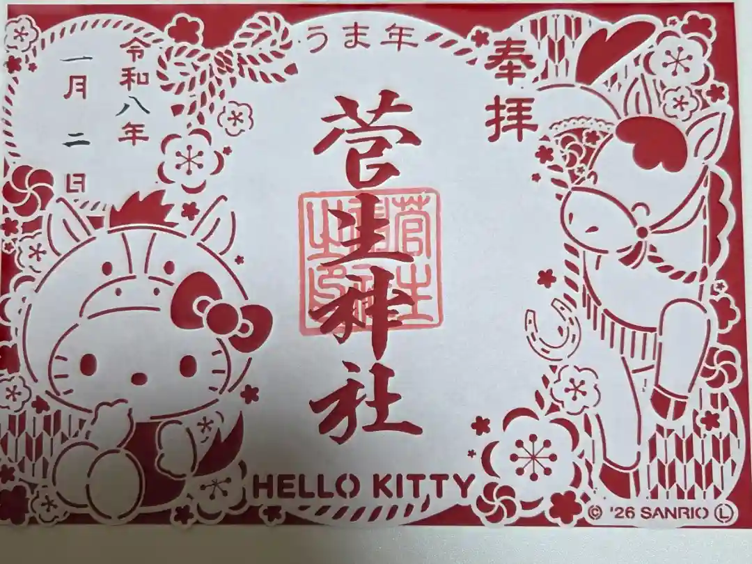 右から「開運厄除」の文字が金色で書かれ、その隣に金色で葵の紋が押され、その下に「菅生神社参拝」の印が押されています。印の上から「菅生神社」と墨書きされています。
