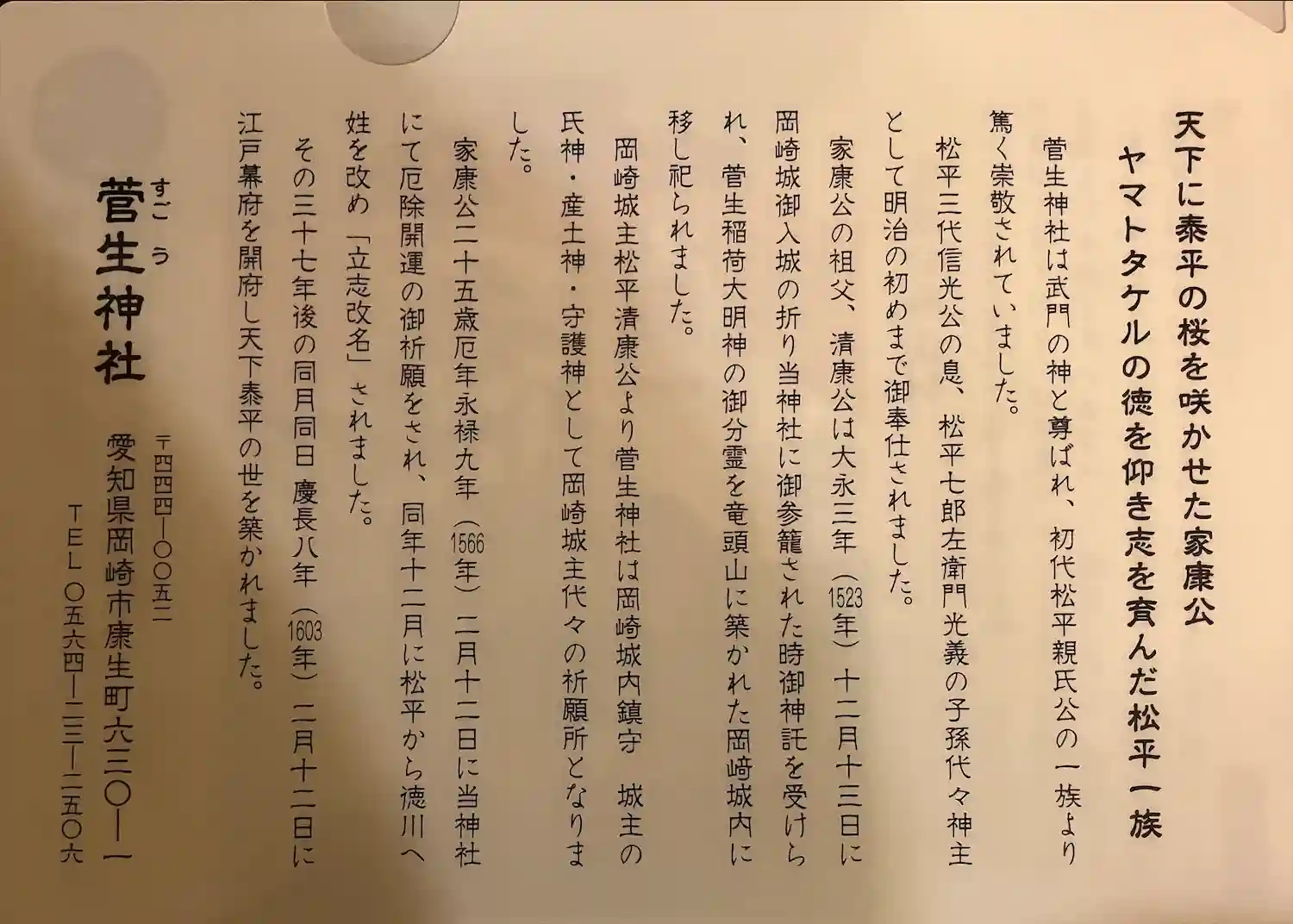 | ご祭神 | 《主》天照皇大神,豊受姫命,須佐之男命,《配》菅原道真公,徳川家康公 | |