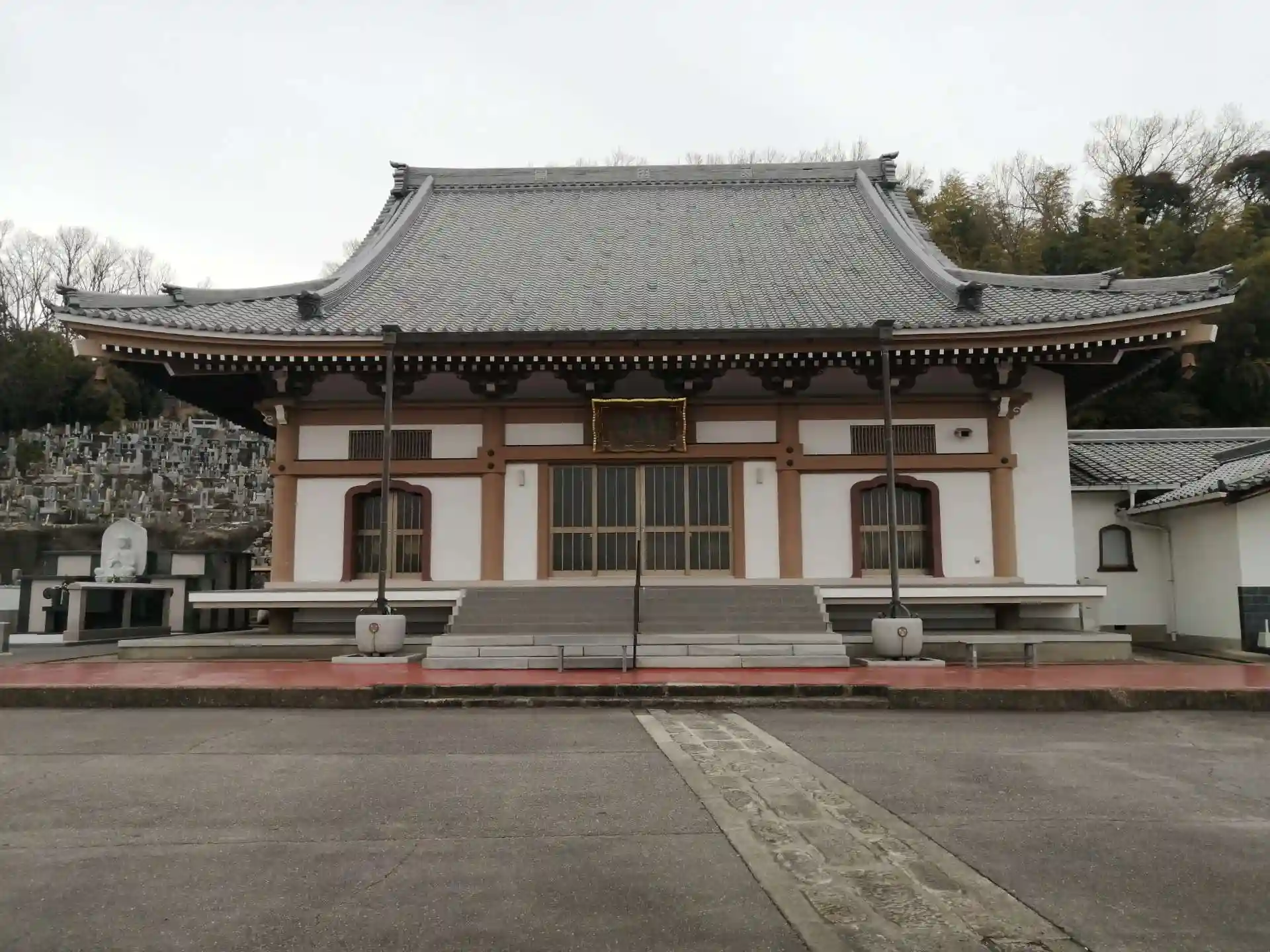 山門の右側を通り抜けた右側に30台位停めれる駐車場があります。車を停めて石段を上がると境内。正面に本堂です。本堂に入れましたので堂内で手を合わせました。セルフ用御朱印を探したら「御朱印は旧本堂に」という貼り紙がありました。え?旧本堂? 本堂から出て、周りを探しましたが見付ける事が出来ません。仕方無く庫裏の呼び鈴を鳴らしました。ご住職の奥様?が出て来られたので「御朱印が置かれている旧本堂は何処ですか?」とお聞きしたら「旧本堂ってわからないですよね。庫裏と(現)本堂の間なんです。」と仰有って私の奉納経を持っていかれて朱印を押印して頂けました。(だったら始めて人でもわかる様な貼り紙にして欲しいなあ。)