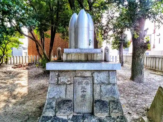 鳥居をくぐった右手に砲弾のモニュメント。戦前、子供達の精神教育の目的として町長さんが建立を申請し認可をとりました。戦後は、この様な砲弾を二度と撃つこと、撃たれることの無い平和を願うという目的に変わっています。