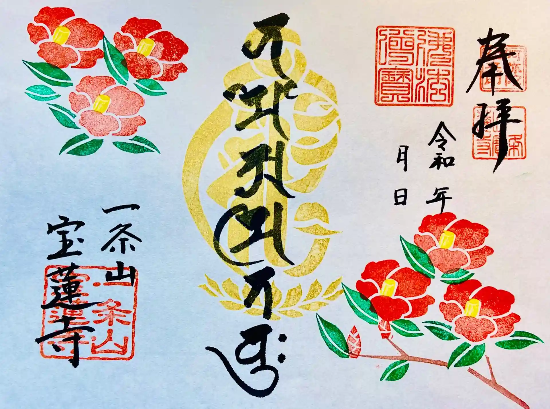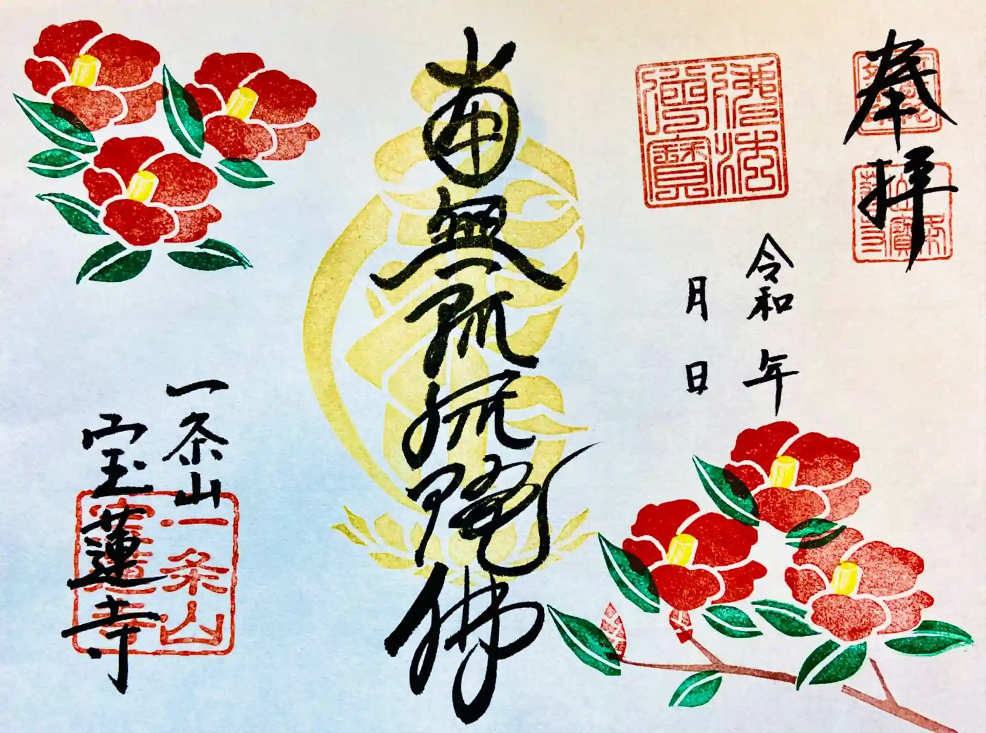 椿の判子を押した、梵字と六字名号の「椿の御朱印」です。
