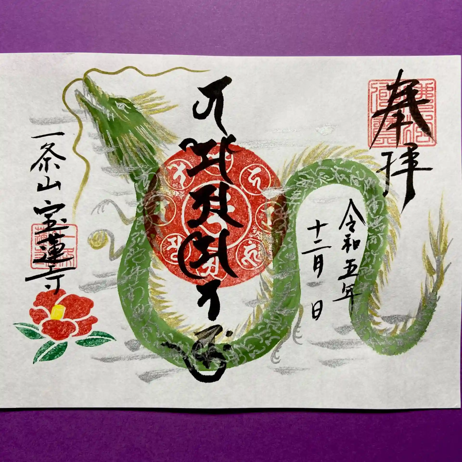 「椿の緑龍」御朱印、椿の手作り判子と緑の龍の御朱印です。