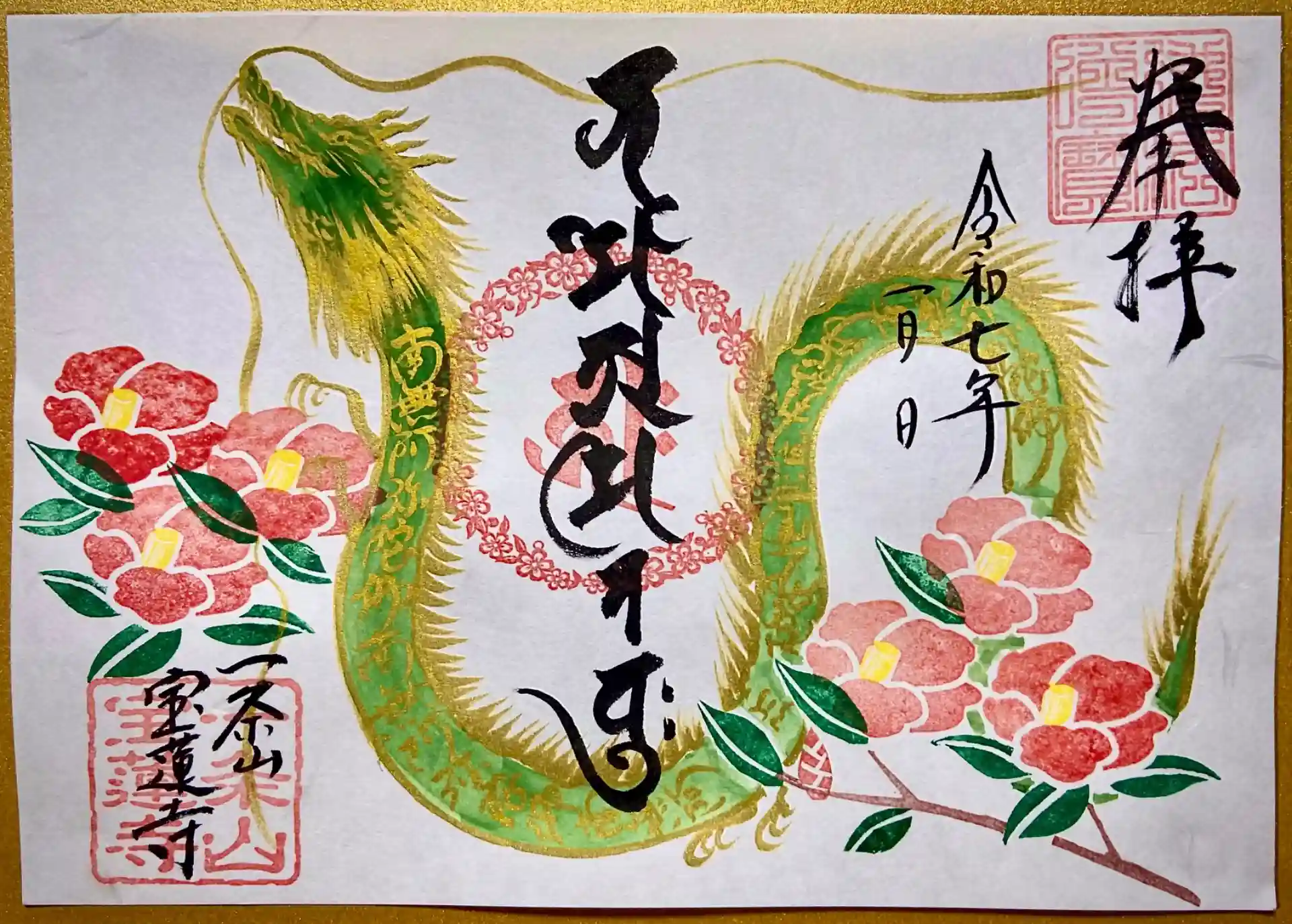新年を迎えるにあたり今年一年も阿弥陀様に守護されますように願いを込めてデザインした御朱印です。中央には南無阿弥陀仏を金文字の梵字でお書きします。